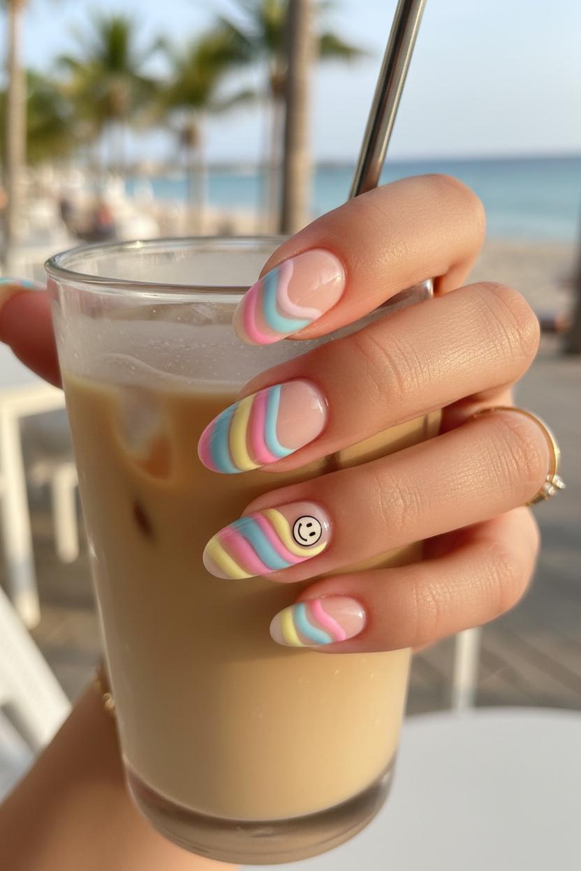 Ready to lean into swirls? Medium almond and oval shapes elongate fingers and give those ribbon-like waves room to dance. Paint curvy, side-swept lines in alternating brights—neon peach, electric lime, sky blue—and let them hug the nail’s natural curve for a dreamy, flowing look. Almond nails are also perfect for wink-and-grin accents: place smiley nail stickers at the lower third so they peek out when you hold a drink or snap a photo. If you love a bolder vibe, a soft coffin (ballerina) at a medium length becomes a little canvas for mix-and-match squiggles, smileys, and minimalist dots across each finger. Keep the length comfortable for everyday life; a fingertip-grazing free edge keeps cute nail designs playful rather than high-maintenance.