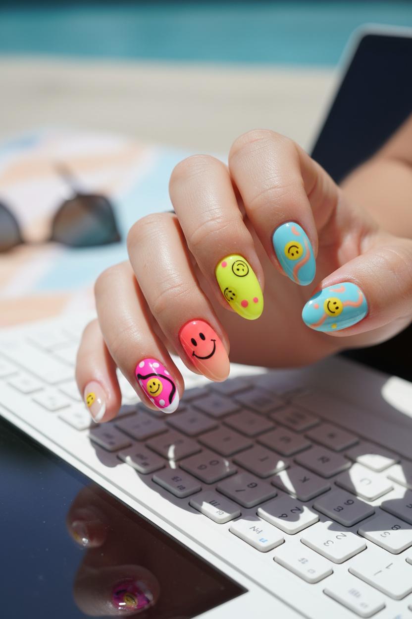 For an easy rhythm, map your pattern like a mood board: one hand leads with lively swirls, the other leans into dots, and both share a couple of grinny accents to tie it all together. Work in thin coats and cure as you go under a UV LED nail lamp if you’re using gel; this keeps edges crisp and colors bright, and it makes layering a breeze. Try a palette that feels like beachside candy—bubblegum pink with lemon dots, cobalt loops with sunny smiles, or neon green waves over lavender jelly. When the mix feels balanced (big dots opposite delicate swirls, stickers spaced like tiny exclamation points), you’ve landed on that polished-but-playful manicure moment. These are cute nail designs that read editorial yet remain totally approachable for summer nail art.