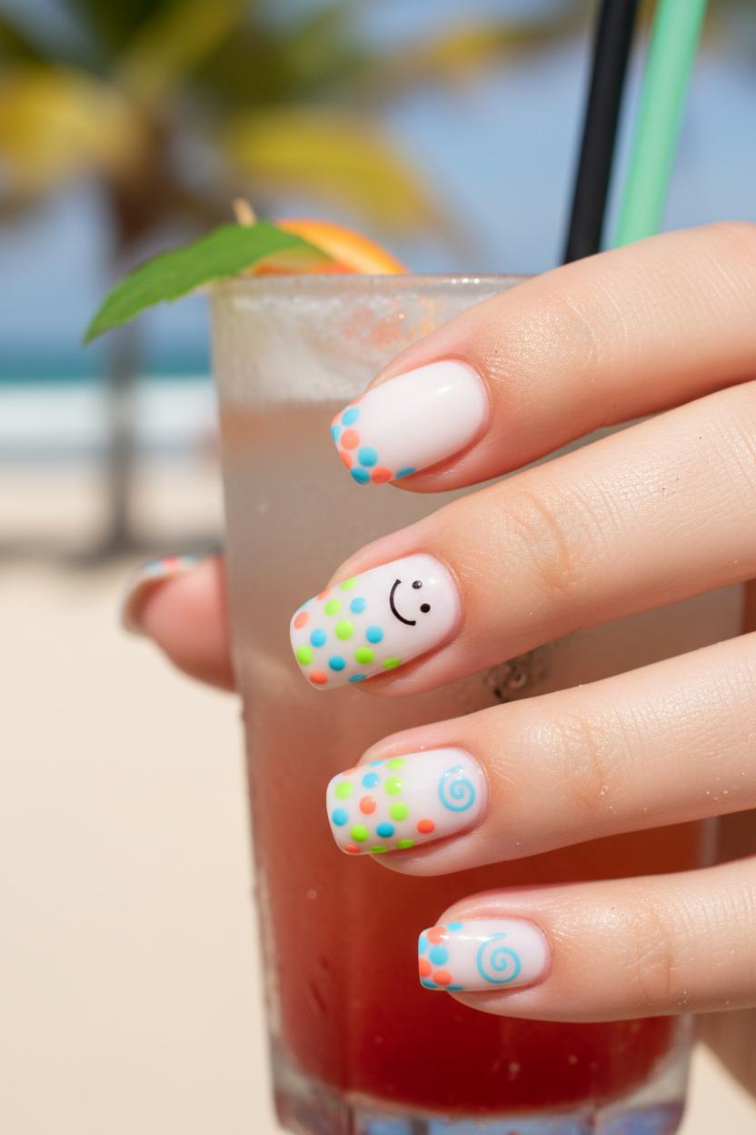 Think of shape and length as the frame that makes your fun nails really pop. If you love dots, swirls, and smiley faces, short to medium squoval and round nails are the friendliest starting points—practical for pool days yet big on charm. A short squoval gives you a sturdy edge for polka-dot tips and tiny doodles, while round nails make a playful manicure feel soft and balanced. Try clustered confetti dots at the cuticle or a dotted French; they’re easy nail ideas that flatter every hand. For clean, uniform circles, reach for nail art dotting tools, then layer a punchy accent in gel nail polish neon for that sunshine-bright finish. If you’re in a hurry, press on nails cute in a short round or squoval shape deliver instant summer nail art without the commitment—just add smiley nail stickers to one or two accents and you’re done.