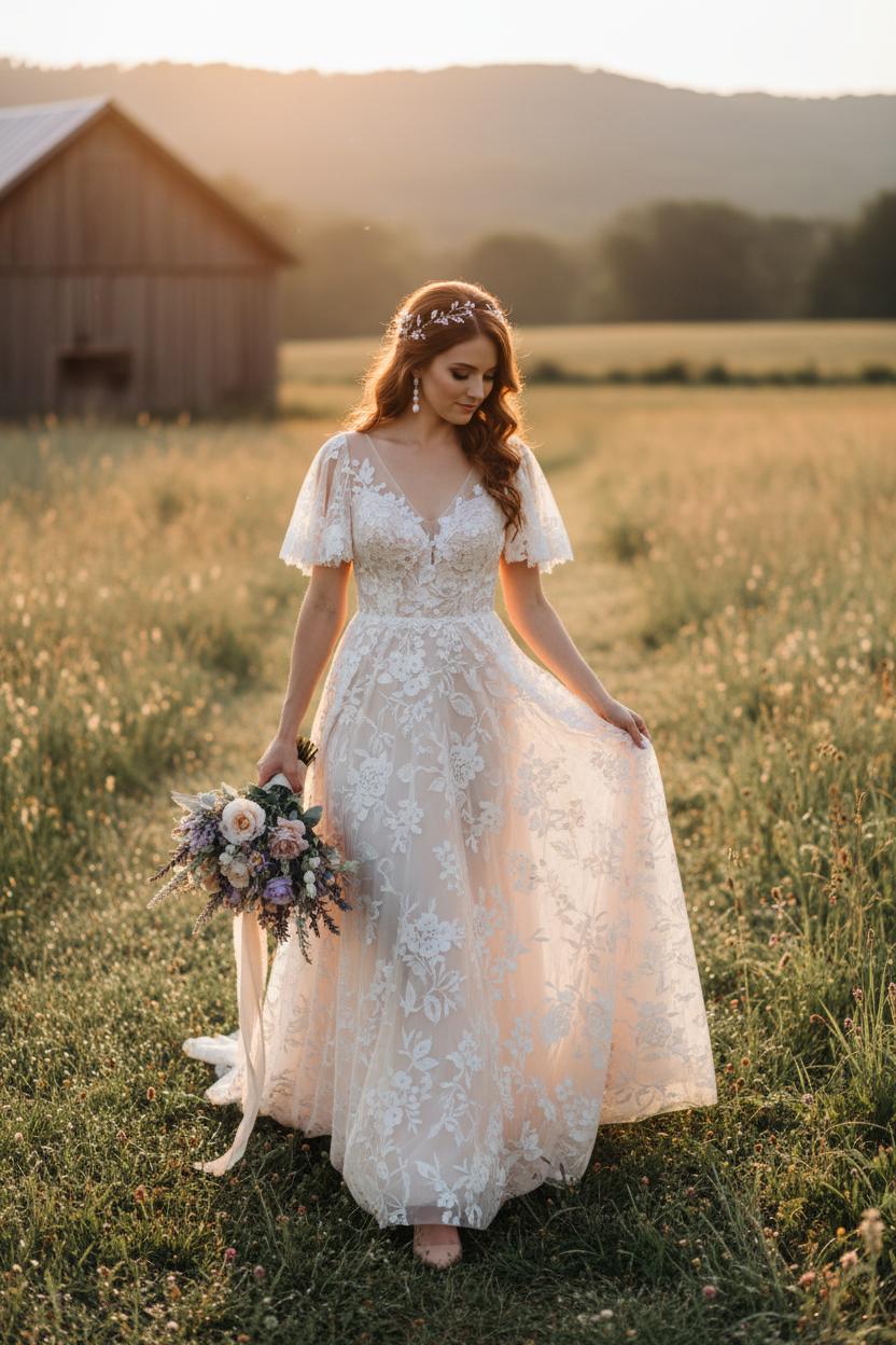 Sleeves and trains set the mood. Delicate flutter sleeves feel whimsical with a wildflower bouquet artificial, and billowy bishop sleeves bring a vintage-poetic touch to rustic bridal looks. Off-the-shoulder necklines balance exposed rafters with a little neckline drama, while illusion long sleeves scattered with appliqués are perfect if you’re craving coverage without weight. For trains, consider the terrain: a sweep or court train gives you that romantic trailing moment without collecting the entire pasture, and a chapel-length train with a quick bustle keeps photos dreamy and the reception dance-ready. Detachable overskirts are another smart pick—floaty for vows, streamlined for s’mores and sparkler exits. Finish with gentle glow details: pearl drop earrings catch lantern light, a leafy bridal hair vine weaves beautifully through loose waves or a low chignon, and a soft tulle veil feels more meadow than ballroom. Keep makeup warm and dewy, and let your bouquet bring the color story—muted mauves, wheat, and greenery that nod to fields at golden hour. Together, these touches create a barn wedding dress moment that’s timeless, textural, and totally in step with the countryside—proof that the most breathtaking rustic bridal looks are the ones that feel like you.