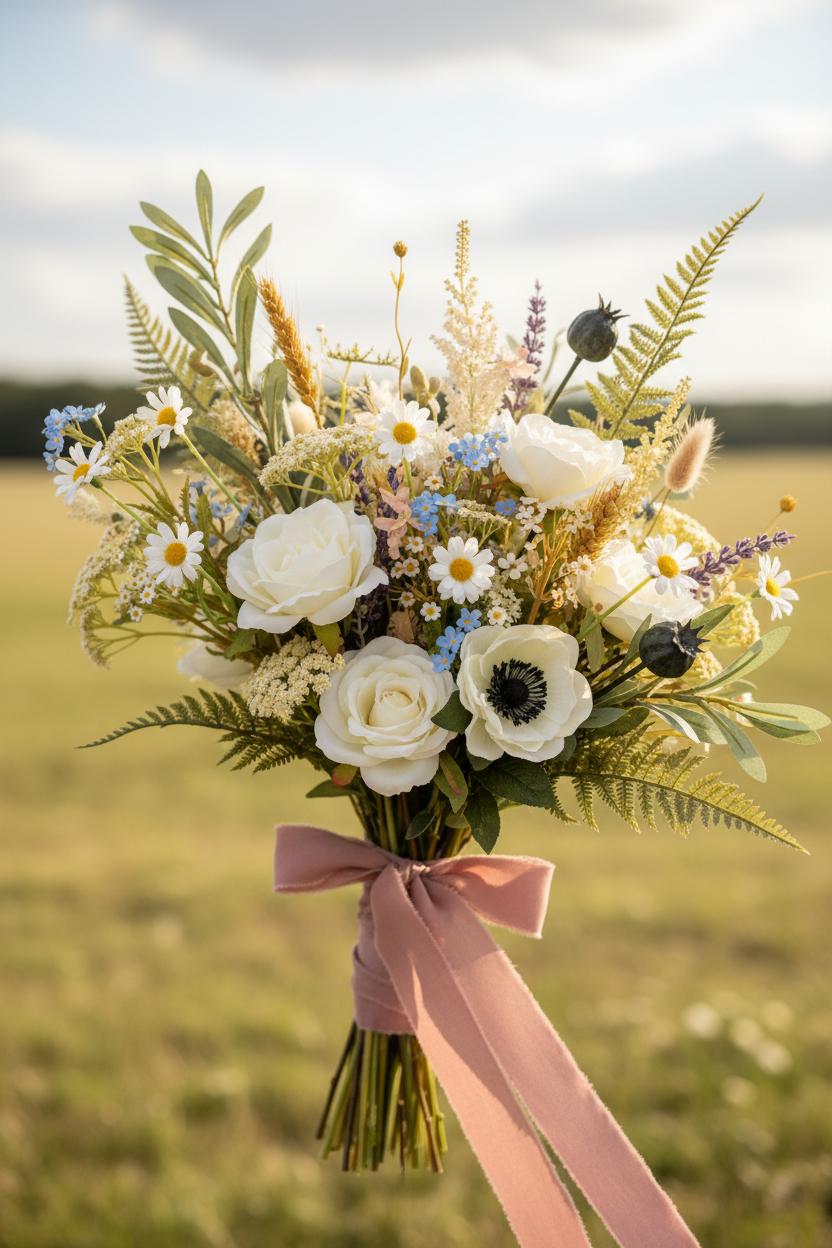 If you love the look of armfuls of meadow blooms but want something you can arrange early and keep forever, an artful faux bouquet can be magic—soft, airy, and totally believable. The trick for rustic bridal looks is mixing textures and movement so it feels like you just gathered it on a morning walk. Blend small, delicate flowers (chamomile, teeny daisies, forget-me-nots) with wispy stems (lavender, yarrow, astilbe) and a few focal blooms like anemones or open garden roses. Tuck in wild greenery—fern fronds, seeded eucalyptus, and olive sprigs—so the edges look untamed. Real-touch stems and a couple of dried bits (bunny tails, wheat, nigella pods) add that “I swear it’s real” depth a countryside bride craves.