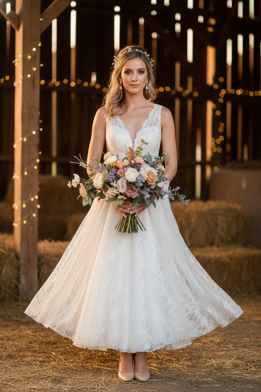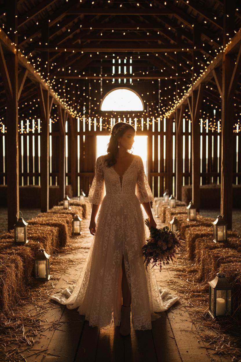 When you picture walking down a twinkle-lit aisle in a weathered hayloft, think silhouettes that move with the setting. An A-line barn wedding dress is the forever favorite—easy, romantic, and made for breezy barns where you’ll want to glide rather than fuss. A soft sheath works beautifully for the countryside bride who loves clean lines and that effortless, boho wedding style; it skims the body and lets your accessories and florals shine. If you’re after a little drama, a fit-and-flare gives you curve and swish without overpowering the rustic space, while a tea-length option pairs perfectly with dancing on wooden floors (and shows off your nude bridal heels or even cute ankle boots). Lace is still queen here: a lace wedding gown in ivory or soft champagne reads heirloom and handmade—think meadowy patterns, eyelash trims, and whisper-light tulle layers. For extra charm, choose a lace bridal gown with a small slit or side godets to make that barn breeze your best accessory.