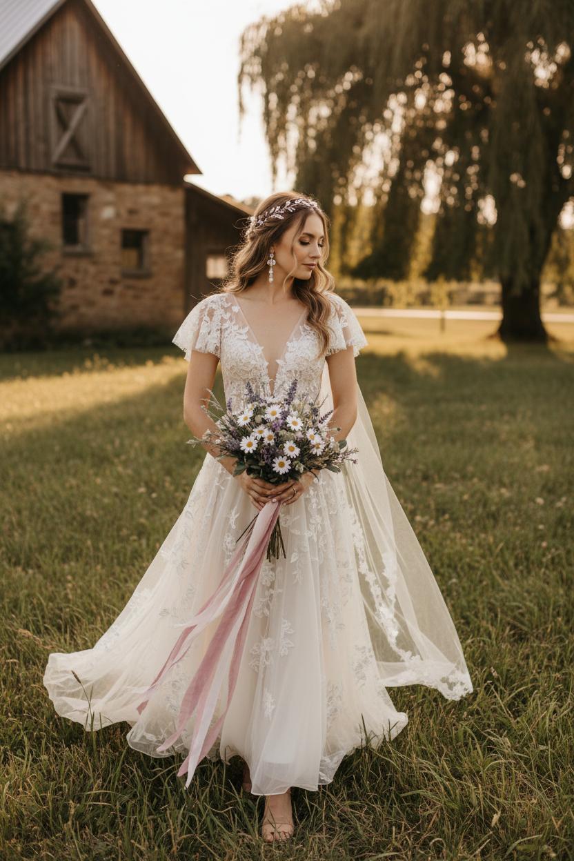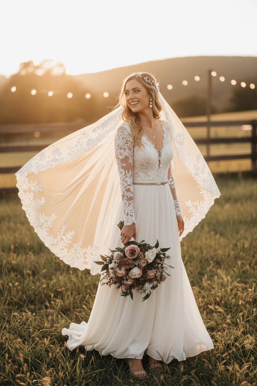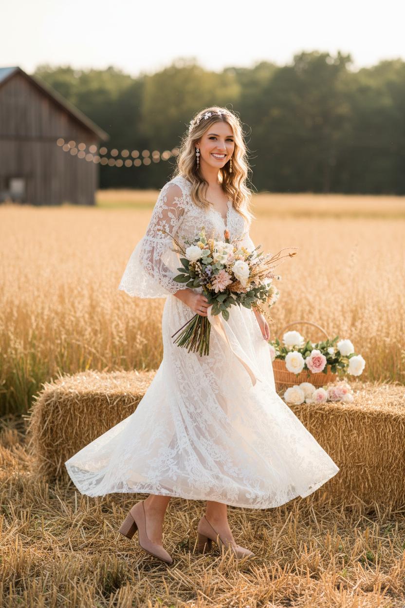 Consider the venue’s vibe when refining details. A keyhole or low back complements a barn wedding dress, while a modest high neckline suits a quaint chapel or orchard ceremony. Test movement—your countryside bride moment might involve uneven paths, so choose a manageable train and ask for a bustle you can rely on. Subtle sparkle woven into the lace catches golden hour without competing with nature. Accessorize with organic touches: a bridal hair vine threaded through loose waves, pearl drop earrings for a hint of heirloom glow, and nude bridal heels that blend with the landscape and elongate your silhouette. If you want no-fuss florals from rehearsal to reception, a wildflower bouquet artificial can look stunning in photos and won’t wilt when the dancing starts.