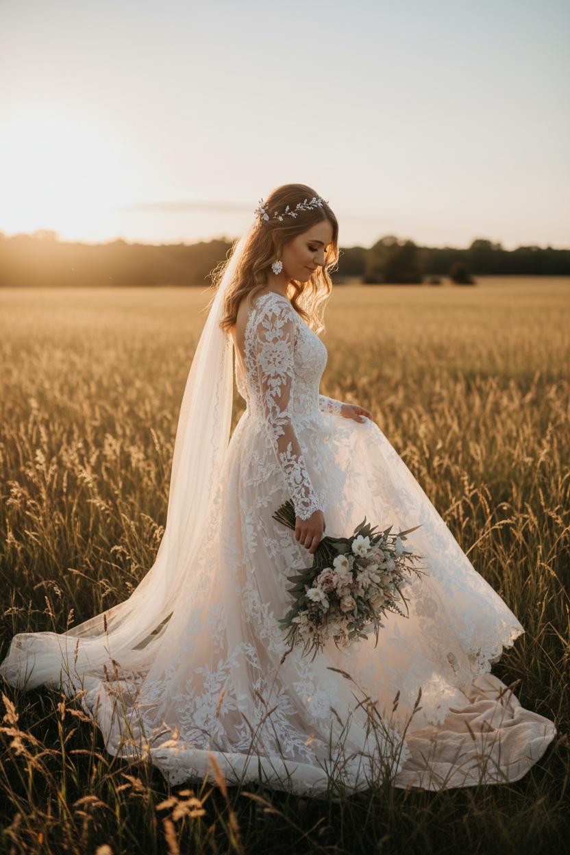 There’s a reason golden hour feels like it was invented for a countryside bride—the light wraps around you like honey, turns meadow grasses into spun gold, and makes every piece of lace glow. Plan to start portraits 60–90 minutes before sunset so you can warm up with a few walking shots, then ease into that dreamy backlit magic. Stand with your shoulder to the sun and let your photographer shoot slightly into the light; it softens skin, illuminates veils, and sets a lace wedding gown aglow without washing out detail. If you’re wearing a barn wedding dress or a delicate lace bridal gown, ask for close-ups that catch the texture on your sleeves and bodice as the sun dips. Think movement—gentle twirls, brushing fingertips through tall grass, a slow stroll hand-in-hand—to match the soft-glam mood of rustic bridal looks and a boho wedding style. As the light cools into blue hour, linger for a silhouette kiss or a quiet forehead touch against the pastel sky.