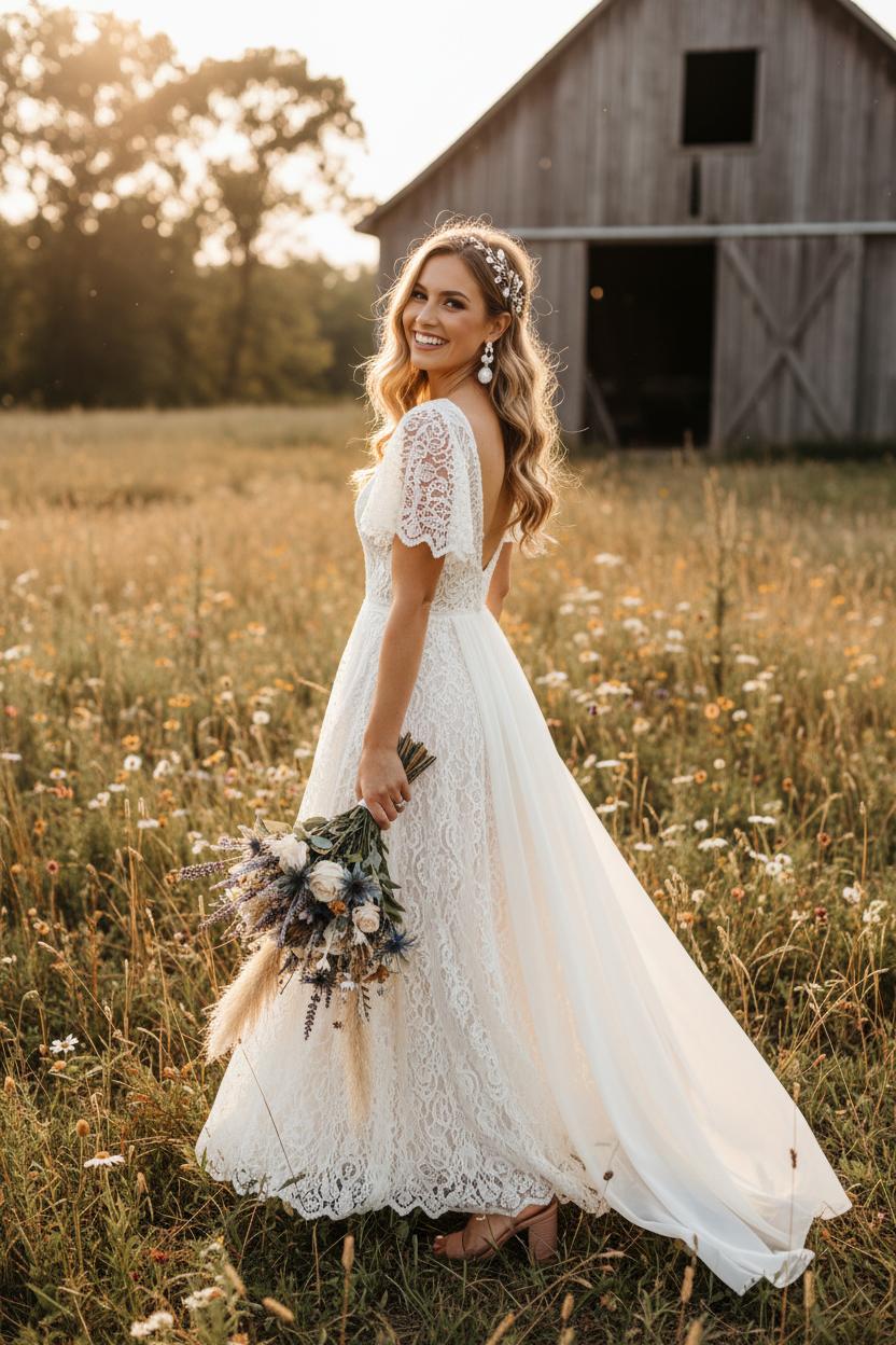 When it comes to the dress, lean into fabrics with story and movement. A lace wedding gown with flutter sleeves, an open back, or a relaxed A-line skirt brings that free-spirited elegance to life. If you’re dreaming of a barn wedding dress, picture crochet-inspired lace, scalloped trains, or a floaty chiffon layer over a fitted slip—polished enough for vows yet easygoing for dancing on old wooden floors. A lace bridal gown pairs beautifully with a sheer overskirt for ceremony drama, then slips into something lighter for sunset portraits in the fields. The magic is in contrasts: delicate lace against rustic beams, bare shoulders framed by a soft shawl, wind-tousled hair meeting heirloom-level details.