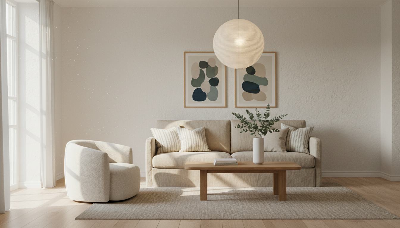 When the sun slips low and the city quiets, the magic of a Scandi living room really begins: switch on a paper lantern lamp and let that milky, cloud-soft glow pool across your neutral interior. The rice paper diffuses light in the gentlest way, flattering everything it touches—linen sofa, pale walls, even the grain of natural wood—so nothing feels harsh or fussy. I love tucking a floor-height lantern beside the sofa and another smaller one on a console, keeping light low and layered the way Nordic decor does so well. Think warm bulbs (2700K or below) and dimmers so you can dial in the mood; it’s the secret to a minimalist living room that still feels human and warm. Add texture underfoot with a wool area rug to absorb sound and bounce back that soft radiance, and invite a cozy nook with a boucle accent chair angled just toward the glow, like it’s leaning into a fireplace.