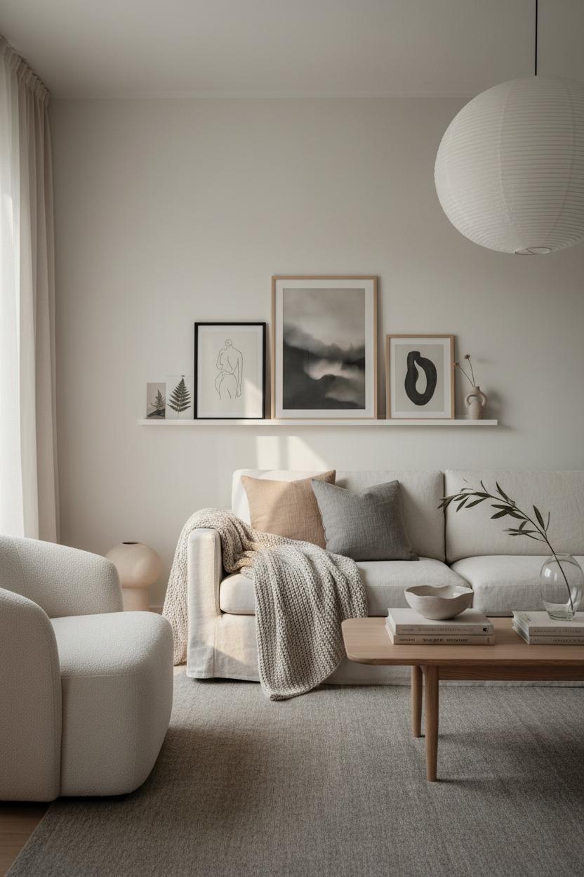 For finishing touches, stick to a tight palette—creamy whites, sandy beiges, and soft grays—then layer materials that whisper rather than shout. A couple of textured cushions, an oversized knit throw, and a simple tray on the coffee table keep the minimalist living room aesthetic intact while still feeling lived-in. Frame inexpensive prints in plain wood frames for understated Nordic decor, and tuck a few leafy stems into a clear glass vase for organic movement. Edit often, display only what you love, and let negative space breathe; it’s the easiest way to keep your neutral interior serene and your budget on track. Small, thoughtful swaps add up, and before you know it, your space will feel light, minimal, and unmistakably hygge.