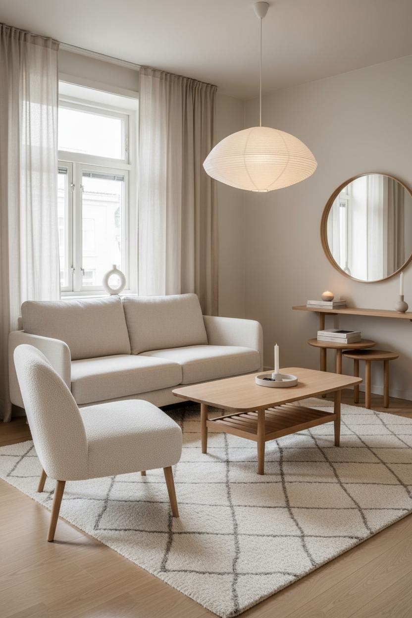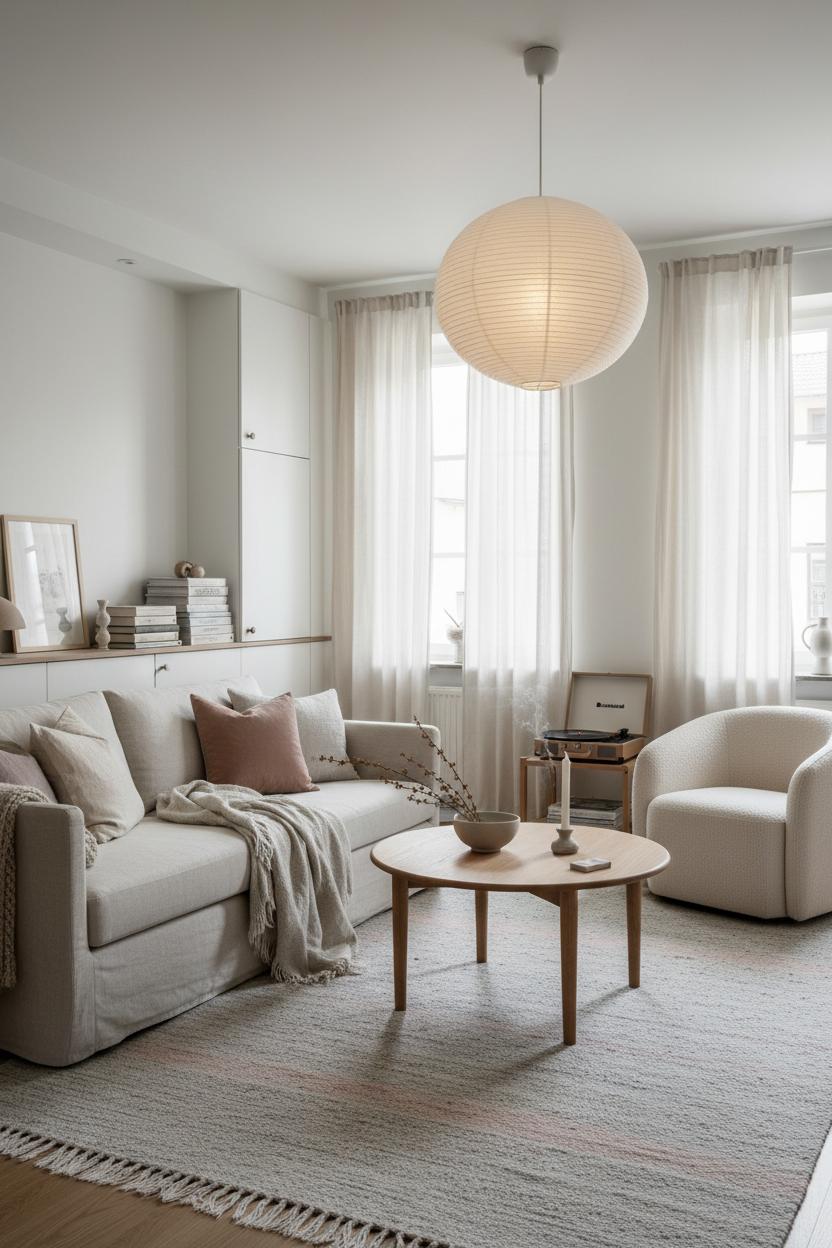 When square footage is tight, start by prioritizing sightlines and leggy silhouettes. Pull your seating a few inches off the wall to let the room breathe, then build a light, low profile around it. A linen sofa with slim arms keeps things airy, and a boucle accent chair adds soft, tactile interest without visual bulk. Choose an oak coffee table with an open base so the floor shows through—instant spaciousness. Keep lighting soft and sculptural; a paper lantern lamp floats overhead like a cloud and diffuses light in that calm, Scandi living room way, casting a gentle glow that makes every corner feel considered.