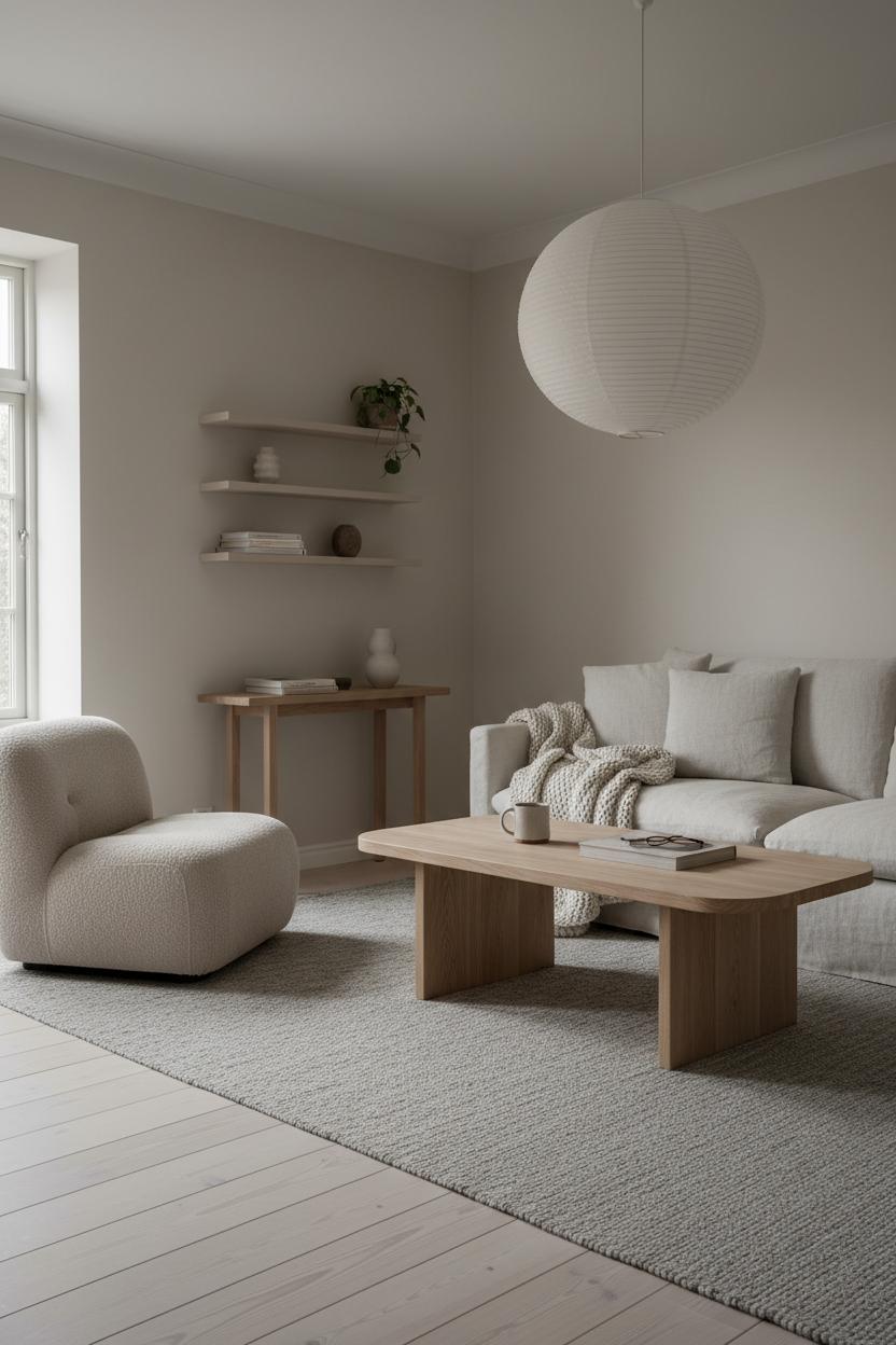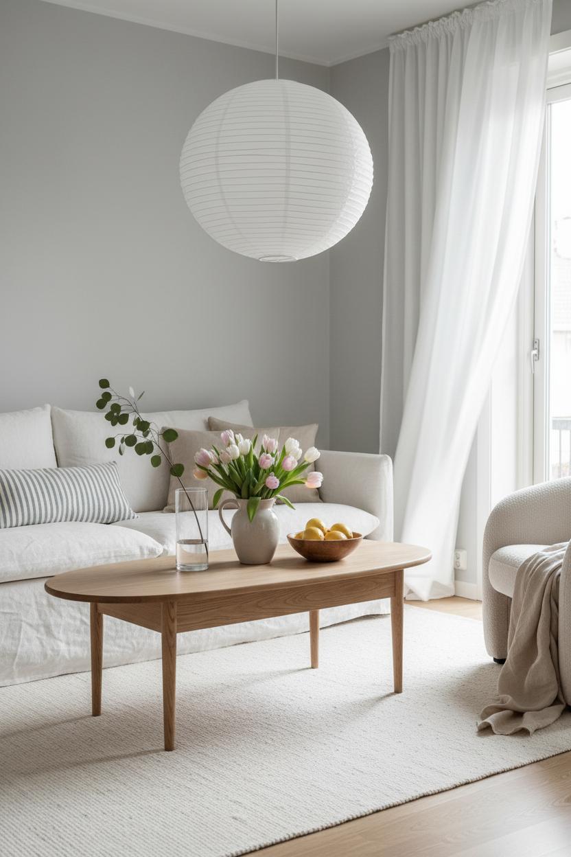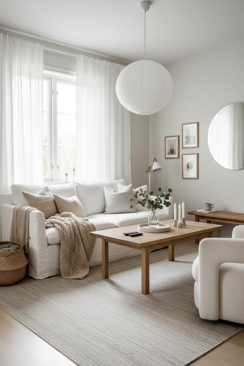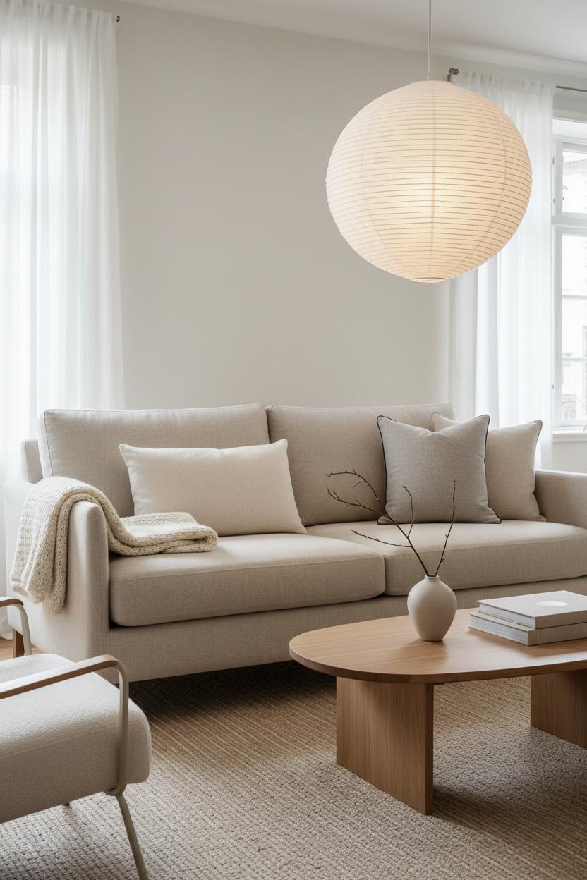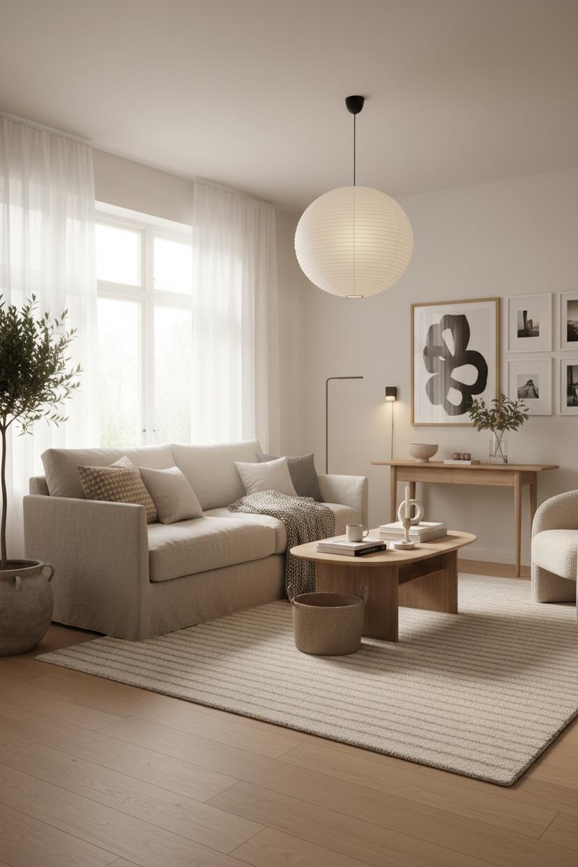 Lighting seals the mood. Layer it: a paper lantern lamp for that soft, moonlike glow; a slim floor lamp for reading; a petite sconce or two if you have them. Add life with greenery—an olive tree in a stone pot or eucalyptus in a glass cylinder—and a few handmade touches like a ceramic bowl or a sculptural candle. Finish with a stack of design books on the coffee table and a tray for a mug and matches, so the room feels ready to live in. Step back: you’ve got a Nordic calm that’s unfussy and warm, a space that invites slow mornings and candlelit evenings—proof that simplicity, handled with care, is the most welcoming luxury.