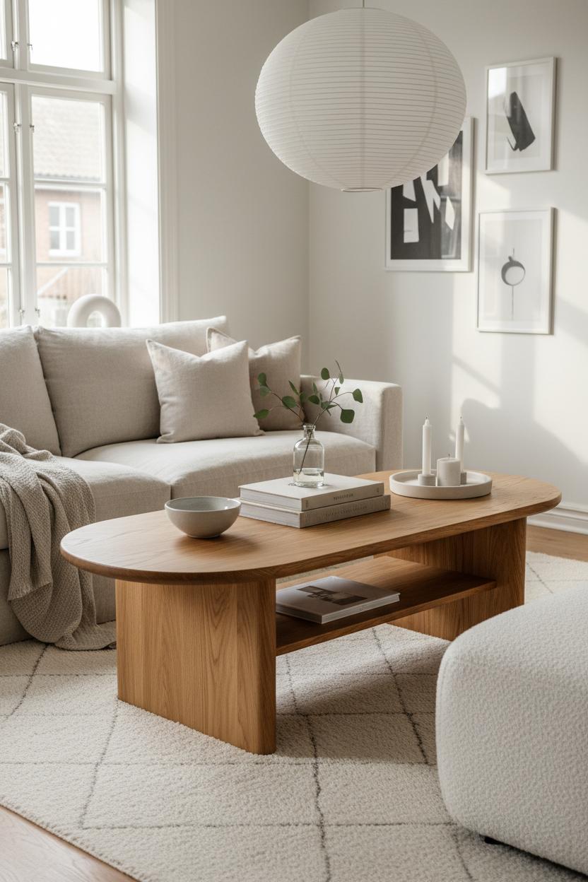 An oak coffee table is the quiet hero that brings a Scandi living room together—warm, grounded, and endlessly versatile. Its honeyed grain instantly softens a neutral interior, adding a natural focal point without shouting for attention. Look for a low, substantial silhouette that feels calm and intentional; oval or softly rounded edges are especially lovely in a minimalist living room because they keep the flow gentle and kid-friendly. Style it with restraint: a shallow ceramic bowl for keys, a single stack of design books, a sprig of eucalyptus in a bud vase. The beauty of Nordic decor is in the edit, so let negative space do some of the talking. If storage matters, choose a design with a slim shelf where a linen throw or magazine can tuck away neatly. Morning light will pool across the wood, and in the evening a paper lantern lamp will cast the dreamiest glow, turning this little island into the coziest gathering spot in your hygge home.