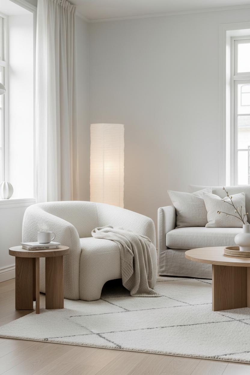 In a Scandi living room, simplicity really sings when texture does the talking, and that’s exactly why a boucle accent chair earns a permanent spot. Its nubby, cloud-like weave brings a soft counterpoint to clean lines and pale woods, adding depth without disturbing that calm, minimalist living room vibe. Tuck one into a sun-washed corner beside a paper lantern lamp and you’ve got instant reading-nook magic—diffused, candle-like light, a cup of tea, and a cozy perch that feels like a hug. In a neutral interior, the looped fabric catches the light so beautifully, offering subtle shadow and dimension where a flat, smooth chair might fall short. Think of it as the tactile heartbeat of a hygge home: grounding, warm, and quietly luxurious, like the best of Nordic decor translated into a single seat you’ll never want to leave.