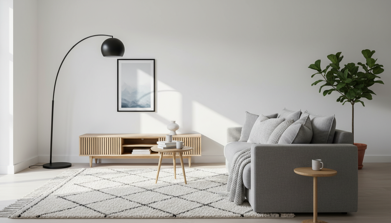 Nothing transforms a minimal living room faster than a plush wool area rug layered thoughtfully underfoot. In Scandinavian interior design, texture becomes the quiet color, and a dense wool pile in oatmeal, mushroom, or soft heather gray instantly adds warmth without clutter. Lay it over hardwood or a slim flatweave base to build subtle depth—think of it as a visual exhale that makes a hygge home feel grounded. The fibers cushion footsteps, soften echo, and visually knit together your seating, all while keeping that airy, Nordic decor simplicity intact. Choose a low to medium pile with a barely-there pattern—like a windowpane or speckled melange—so the room stays serene and the rug reads as part of a neutral home palette rather than a focal shout. The result is that soft, welcoming look you save on Pinterest: restrained, layered, and quietly luxurious.