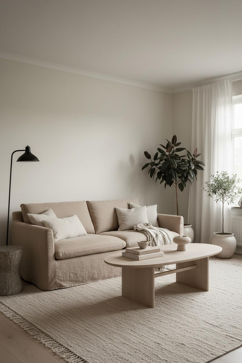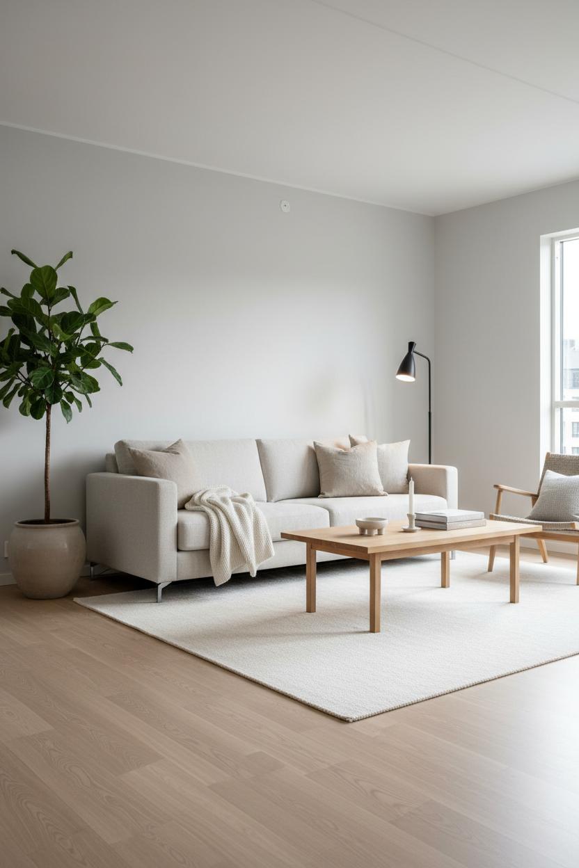 Once your backdrop is set, layer in texture like you’d layer a winter outfit. A linen sofa instantly reads relaxed and breathable, while a wool area rug adds softness underfoot and subtle movement in the weave. Float furniture so the room can breathe—negative space is essential in a minimal living room—and choose a small family of materials you can repeat: light oak, linen, wool, and ceramic. A slender black floor lamp acts like punctuation, adding just enough contrast to keep Nordic decor from drifting into monotone. Let greenery break up the neutrals with life and height; a ceramic planter with an olive tree or rubber plant keeps the palette organic and tactile. Edit as you style: a stack of well-loved books, a candle in sandy clay, a single throw in a natural stripe. When every piece earns its place and color shifts are subtle rather than sharp, the room feels calm all day and quietly glows at night. That’s the secret of Scandinavian interior design at home—simplicity, softness, and a palette that invites you to exhale.