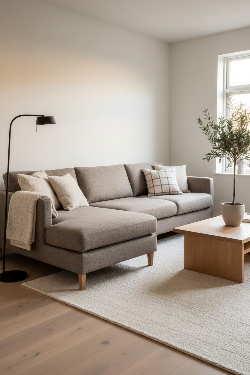 For shape, think low-profile and welcoming. A streamlined sofa with track arms and slender wood legs reads contemporary without feeling cold, and a chaise or petite modular sectional can tuck into a corner to maximize lounge space. Pair your linen sofa with a light oak coffee table to echo Scandinavian craftsmanship—it warms the palette and balances linen’s cool hand. Underfoot, a wool area rug adds plush texture and anchors the seating zone, layering softness on softness in true Nordic decor fashion. For contrast, a black floor lamp arcs or stands gracefully beside the sofa, punctuating all that beige and cream with a crisp, grounding moment. Finish with a ceramic planter and an airy olive tree or rubber plant to bring life and height to the room; organic greens are the freshest accessory in a space that celebrates simplicity.