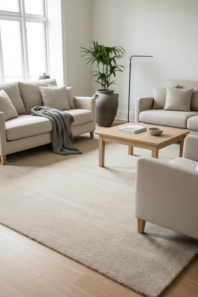 For layout, go generous so the front legs of your linen sofa and chairs rest on the rug, anchoring the conversation zone along with a light oak coffee table. This scale trick makes the room feel larger and more intentional. Add contrast with a slim black floor lamp and a sculptural ceramic planter—dark metal and artisan clay against wool’s softness is quintessential Nordic balance. If your space gets heavy traffic, lean into wool’s natural resilience; it hides wear beautifully, and those satisfying vacuum lines make it feel freshly fluffed with minimal effort. A quality rug pad keeps layers from shifting and adds extra cushioning for movie nights and barefoot mornings. Keep the palette cohesive—creamy walls, chalky textiles, maybe a charcoal throw—to let the wool area rug earn the spotlight through texture rather than color. It’s the quiet hero of a Scandinavian interior design scheme: cozy enough for a hygge home, refined enough for a minimal living room, and endlessly adaptable as seasons, pillows, and flowers rotate through.