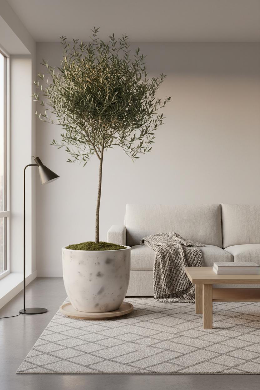 When your palette leans soft and subdued, a single hit of greenery can wake the whole space up. I love anchoring a corner of a minimal living room with an oversized ceramic planter in a matte, chalky finish—think creamy bone, soft gray, or speckled stone that echoes the calm tones of a neutral home. Tuck it by a window so the leaves catch the light, and let the shape do the talking: a slender olive tree for airy height, a rubber plant for glossy structure, or a sculptural monstera if you prefer a bit of drama. The freshness pairs beautifully with the quiet textures that define Scandinavian interior design—drape a linen sofa in a nubby throw, keep a low-profile light oak coffee table clear except for a single book, and let a wool area rug ground everything underfoot. A slim black floor lamp nearby adds contrast, while the greenery bridges warm wood, soft textiles, and cool ceramics for that effortless Nordic decor balance.