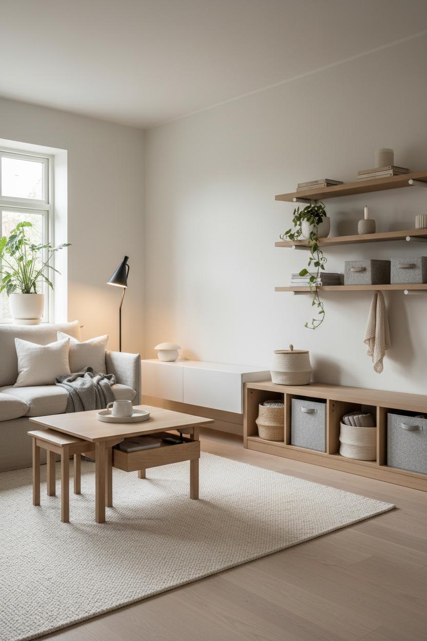 When you think clutter-free, imagine a living room where every surface breathes and every piece earns its place—a quiet, streamlined foundation that still feels soft and welcoming. In true Scandinavian interior design, storage is part of the beauty, not an afterthought, so lean into pieces that hide the everyday without feeling heavy. A slim wall-mounted media console keeps cords out of sight, while a built-in bench with cubbies can corral baskets of magazines, toys, and blankets with ease. Floating shelves offer a light touch for the few objects you want to display—think a couple of favorite books, a candle, and a matte ceramic planter with a trailing vine—so your minimal living room reads curated, not empty. Ground it all with a textured wool area rug and an effortlessly slouchy linen sofa, and you’ve got that relaxed Nordic decor balance of clean lines and cozy layers.