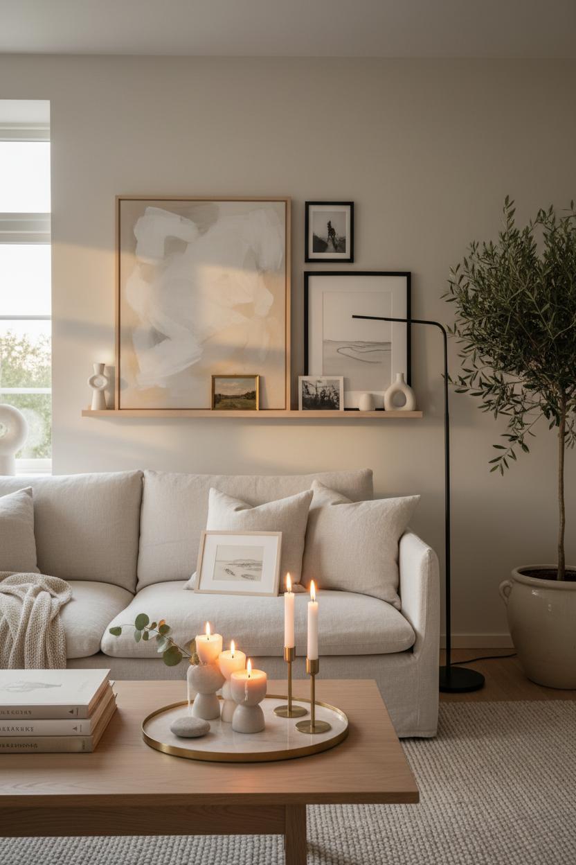 Candles are the easiest way to dial up the hygge home glow, especially as afternoon turns to evening. Mix chunky pillars with elegant tapers in matte ceramic or brushed brass holders, and keep the tones creamy and quiet so the overall mood stays cohesive with your neutral home. Group them in odd numbers on a tray, then add a sprig of eucalyptus or a pebble found on a beach walk to bring in texture without clutter. Choose scents that whisper rather than shout—linen, cedar, a hint of smoke—so the soft flame and gentle aroma become a backdrop to conversation, music, or a good book. Layering candlelight against art adds dimension, casting shadows that make the space feel intimate and lived-in.