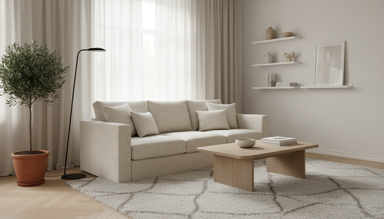 When a room is craving calm, I always start from the ground up with a soft, neutral area rug. It’s the quiet anchor that instantly makes a minimal living room feel finished without shouting for attention. Think shades of oat, ivory, and warm greige that echo beach sand and morning light. A low-pile wool or a tightly woven blend keeps things sleek and practical, while a subtle heather or tone-on-tone pattern adds just enough movement to feel cozy. In a scandi living room, this grounded base lets the shapes do the talking: a streamlined minimalist sofa, an oak coffee table with rounded corners, maybe a hidden storage ottoman tucked nearby, all perched together like a serene little island.