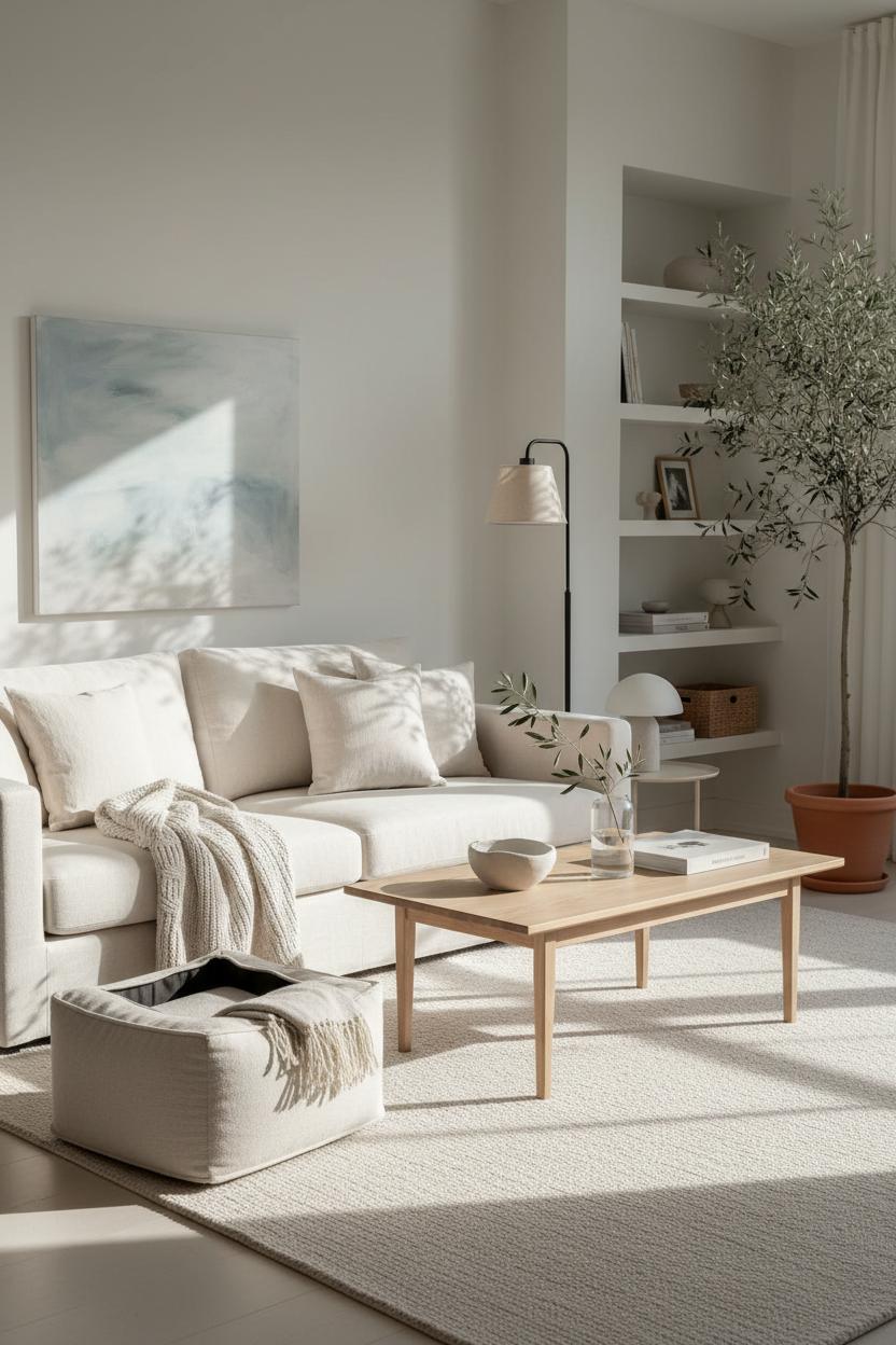 To keep the room cozy and functional, I anchored everything with a plush neutral area rug and a low-profile minimalist sofa that doesn’t visually overwhelm. A slim oak coffee table adds warmth and a natural grain that grounds the simplicity, while a hidden storage ottoman swallows remotes and extra throws so the lines stay clean. I layered in linen throw pillows for that relaxed, rumpled texture that makes you want to sink in, then balanced the soft elements with a few sculptural, weightier accents—an iron floor lamp, a stone tray on the coffee table—so the calm reads intentional, not empty. Greenery is the final, essential layer: a tall olive tree in a woven planter softens a bare corner, trailing pothos adds a casual drape to a shelf, and a small vase of eucalyptus on the table brings movement without visual clutter. I styled plants in odd numbers and varied heights to keep the eye traveling, always leaving an inch or two of blank space around each grouping. With fewer, better pieces and plenty of negative space, the room feels larger, lighter, and infinitely more livable—proof that editing is the most powerful accessory in a modern minimalist home.