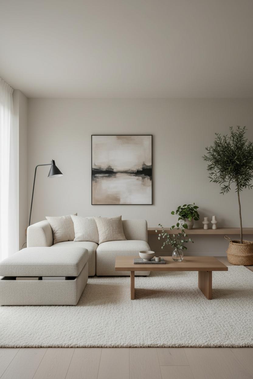 To keep the room rooted in modern minimalist decor, every piece earns its spot. A minimalist sofa in a linen blend brings soft lines and tactile interest; style it with linen throw pillows in slightly different shades so the palette whispers rather than shouts. Underfoot, a neutral area rug with a low-contrast pattern adds movement while letting the architecture breathe. I love pairing an oak coffee table with matte ceramic accessories and a single leafy branch—simple, sculptural, and easy to reset with the seasons. If you’re craving hidden function, try a hidden storage ottoman that tucks away throws and remotes, maintaining that clear, mindful look even on busy days.