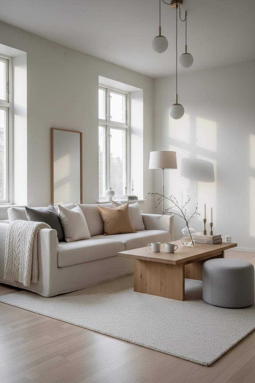 Then, lean into texture to dial up the warmth. Think a low-profile minimalist sofa layered with linen throw pillows and a chunky knit draped just so, all anchored by a plush neutral area rug that softens the edges of the room. An oak coffee table brings gentle, honeyed wood tones and a tactile grain that reads cozy, not heavy; pair it with a hidden storage ottoman to tuck away remotes, throws, and kids’ bits—one of my favorite small space ideas because it keeps surfaces serene. Mix matte ceramics, clear glass, and brushed metal, then add a couple of candles for an evening glow that turns the whole space golden. Keep silhouettes light and leggy so the floor shows (it visually enlarges the room), mount lighting where possible, and edit decor to a handful of pieces that tell your story. The result is a scandi living room that’s quietly layered and deeply inviting—minimal, yes, but never cold—where the textures do the talking, the palette soothes, and the light feels like part of the furniture.