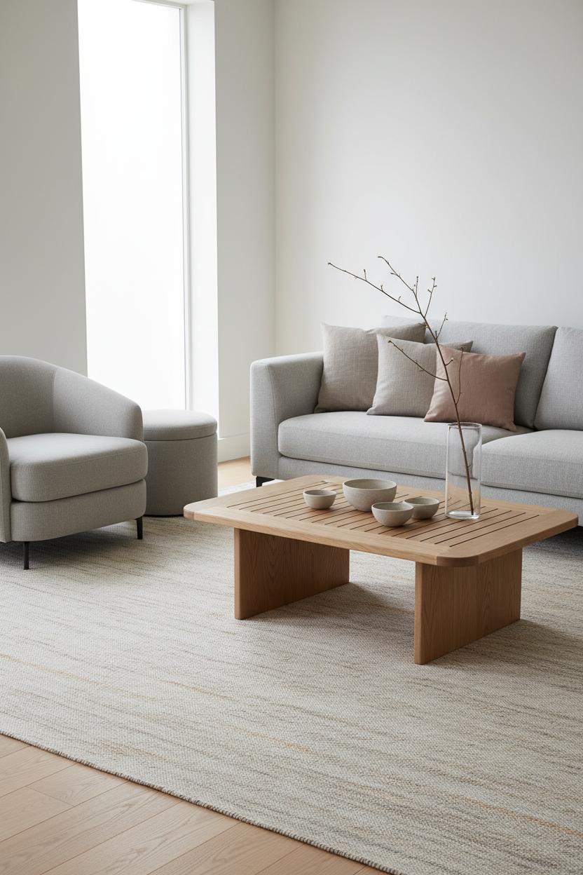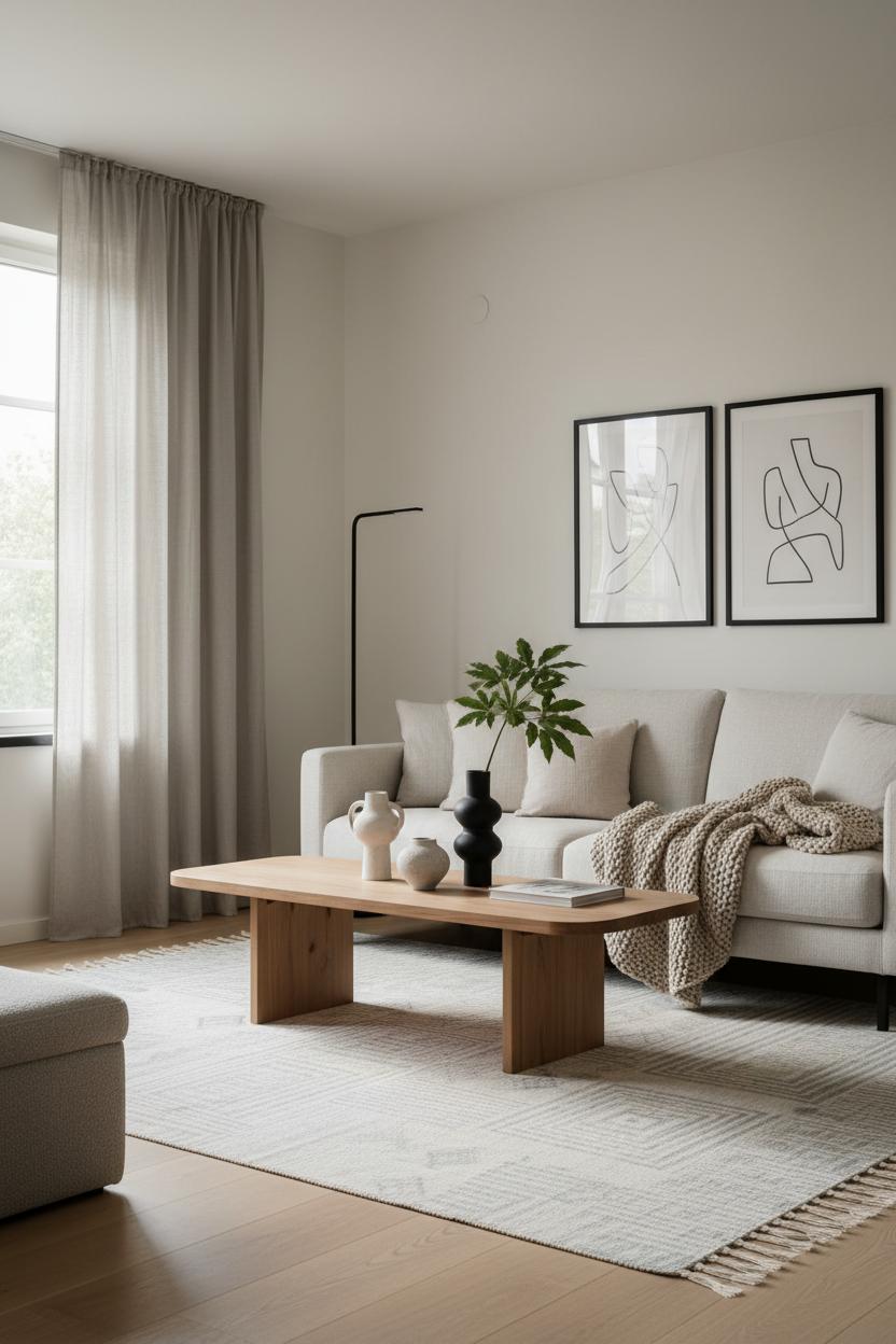 There’s a reason an oak coffee table feels like the quiet hero in a minimal living room: the grain softens all those clean lines, the honeyed tone adds instant warmth, and the sturdy silhouette anchors your seating area without shouting for attention. I like to start with a low, simple tray—matte ceramic or pale stone—to gather the little things you actually touch every day, then build a gentle vignette around it: a stack of linen-bound books, a single sculptural candle, and a snip of greenery in a tiny glass bud vase. Leave generous breathing room so the wood can shine; negative space is the secret sauce of modern minimalist decor. If your minimalist sofa wears linen throw pillows, let the textures speak to one another—the nubby weave against the smooth oak feels very scandi living room in the best, quietly cozy way. Underfoot, a neutral area rug grounds everything and keeps the palette calm, letting the table read as a natural focal point rather than visual clutter.
