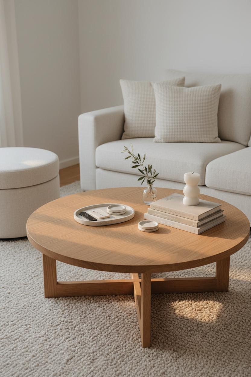 Function deserves a spotlight too. Corral coasters, remotes, and matches in a shallow bowl so the surface stays serene, and if you’re working with a petite layout, lean into small space ideas: choose a round oak coffee table to soften traffic flow, or opt for an open, leggy base to keep sightlines airy. Keep the styling to an odd-number cluster and let two-thirds of the top remain open, so a tea tray can slide in without a shuffle. For those everyday extras you don’t want to see, pair the table with a hidden storage ottoman that tucks throws and magazines out of sight, keeping your neutral home decor looking effortless. I love seasonal swaps that don’t fight the wood—sprigs of olive in spring, a shell or two in summer, tiny pinecones in winter—just enough to whisper the moment. When the evening light pools across the boards, that gentle glow against the rug, the pillows, and the curve of your oak coffee table is what makes the whole room exhale, proof that the simplest pieces, styled with intention, bring the calm we’re all chasing.