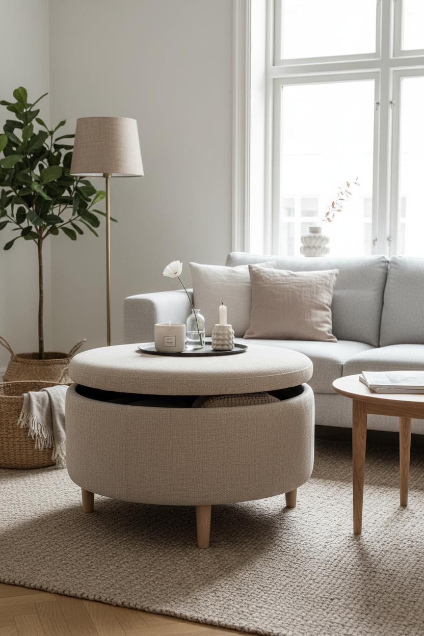 If visual calm is the goal, a hidden storage ottoman is the unsung hero of a minimal living room. It looks like a soft, sculptural accent but quietly swallows the visual noise—remotes, chargers, kids’ books, pet toys—so the room reads as serene even on a Tuesday. I love a rounded, upholstered piece that can float in front of a minimalist sofa, acting as coffee table, footrest, and extra seating all at once. For a scandi living room mood, choose a textured performance fabric in oatmeal or stone and let it sit atop a neutral area rug so everything feels layered yet light. The lift-top makes tidying almost thoughtless: sweep things in, close, exhale. Because it’s compact and versatile, it’s one of my favorite small space ideas—slide it to the side when company comes, pull it center stage for movie night, or tuck it under a window as a perch with a throw.