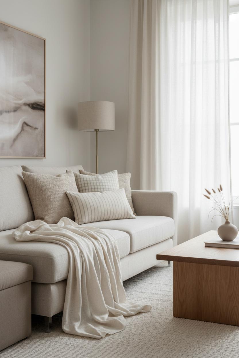 Start with your minimalist sofa as a clean canvas, then build a tight trio of linen throw pillows in mixed sizes—a larger square for structure, a smaller square for balance, and a lumbar for that relaxed, tucked-in finish. Keep patterns subtle: a fine pinstripe, a little windowpane, or a tone-on-tone weave that invites your eye closer without shouting. An oak coffee table brings gentle warmth to all those cool linens, and the grain plays beautifully with the natural slubs in the fabric. If you’re working with small space ideas, a hidden storage ottoman is a lifesaver for stashing extra throws between seasons so the room stays calm and uncluttered. The magic is in restraint: let there be negative space around each piece so the layering feels intentional, not busy.
