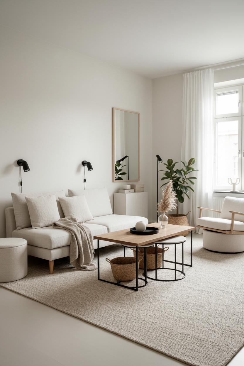 When I think about a scandi living room, I start with light—soft, natural, and uncomplicated. Let windows breathe with sheer drapery or none at all, letting daylight skim across pale walls and blond wood for that airy, expanded feeling a minimal living room craves. A palette of whites, oat, dove gray, and warm sand keeps the space grounded in neutral home decor without feeling flat; the trick is to repeat tones in different finishes so the eye rests while still finding little moments of interest. A slim mirror opposite the window bounces brightness further in, and a single branch in a ceramic vase feels like art without the noise. Leave generous negative space around key pieces so each line feels intentional—this is where modern minimalist decor really shines, giving your room that calm, gallery-like hush that invites a deep breath the second you step in.