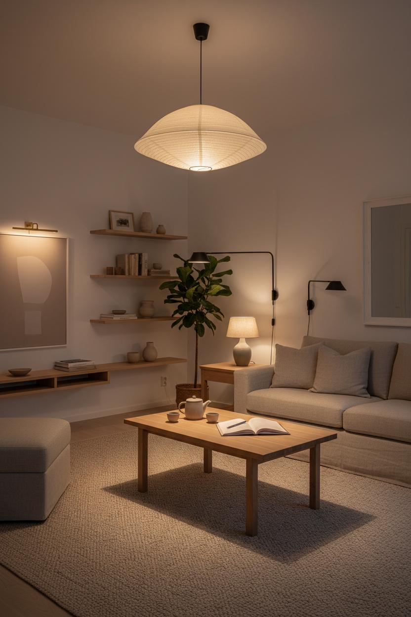 Next, layer in task lighting for the moments that matter—reading on a minimalist sofa, journaling at the oak coffee table, or winding down with tea. A slim arc or cantilevered floor lamp that drops light right over your seat is both practical and sculptural. If you’re renting or short on wiring, plug-in swing-arm sconces are brilliant small space ideas that free up surfaces. Tuck a compact table lamp on a console, and let the hidden storage ottoman pull double duty as a perch or side table with a tray. This is where texture shines: linen throw pillows catch light in the softest way, while a muted ceramic lamp base adds quiet dimension. Keep cords tidy and silhouettes sleek so the room stays uncluttered and easy to breathe in.