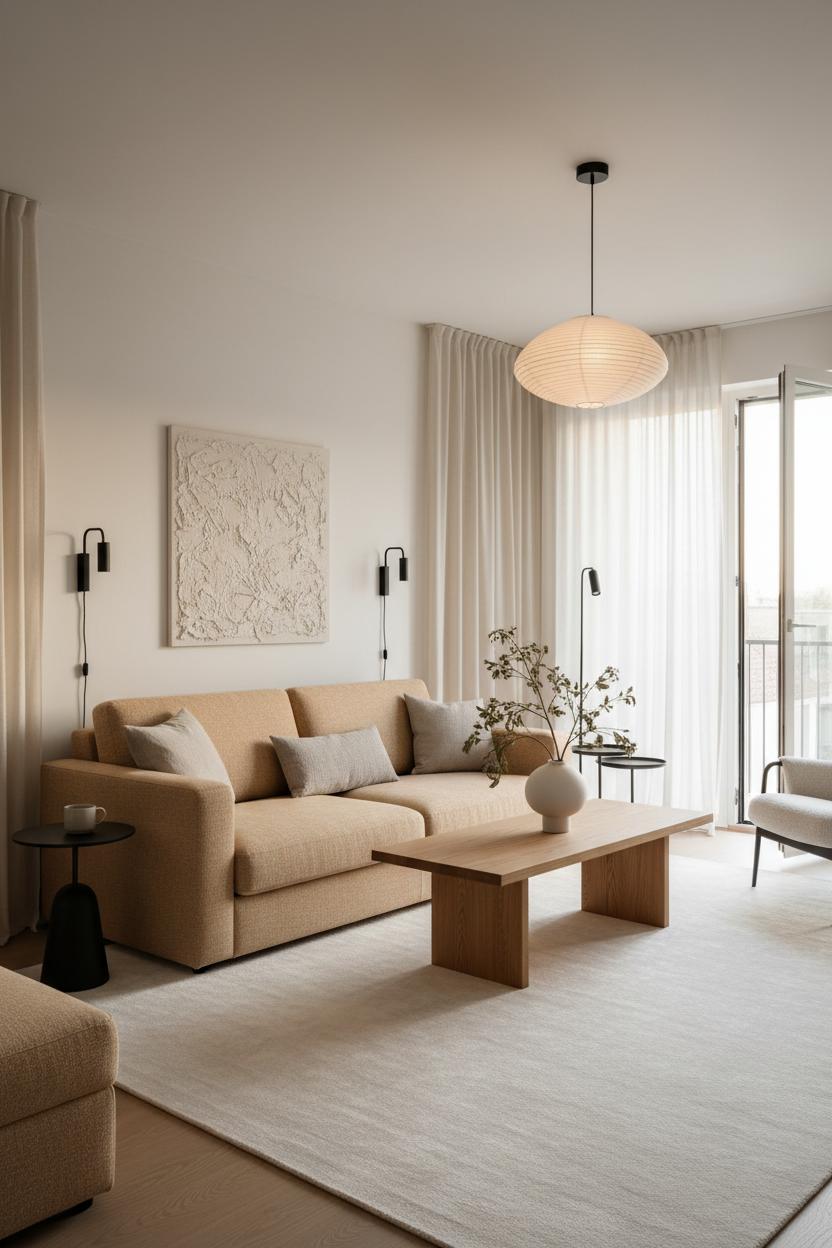 When I pictured the finished space, the vision was simple: a minimal living room that feels like a deep exhale the second you step in. I started by stripping away anything that didn’t serve the room—visual clutter, harsh colors, fussy accents—and then layered back only what added calm and function. The anchor is a low-profile minimalist sofa in a warm, sandy upholstery that whispers comfort without demanding attention. Underfoot, a plush neutral area rug softens edges and quiets the room, while a slender oak coffee table brings that touch of nature I love from a scandi living room mood board. I kept the palette restrained—think soft whites, oat, and pebble—with the gentlest contrast in black metal accents and a few tactile pops from linen throw pillows. The effect is a modern minimalist decor moment that feels collected, not decorated.