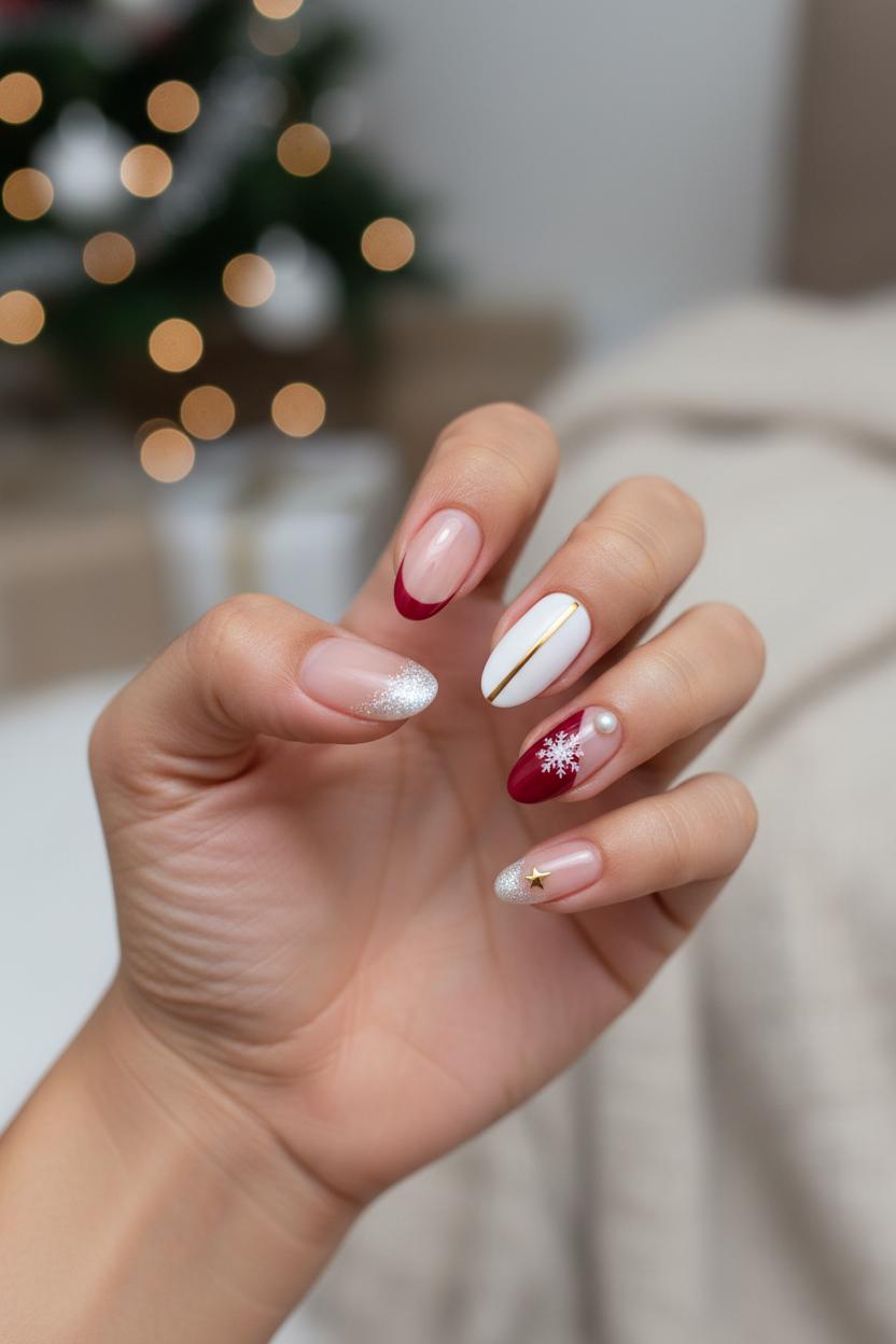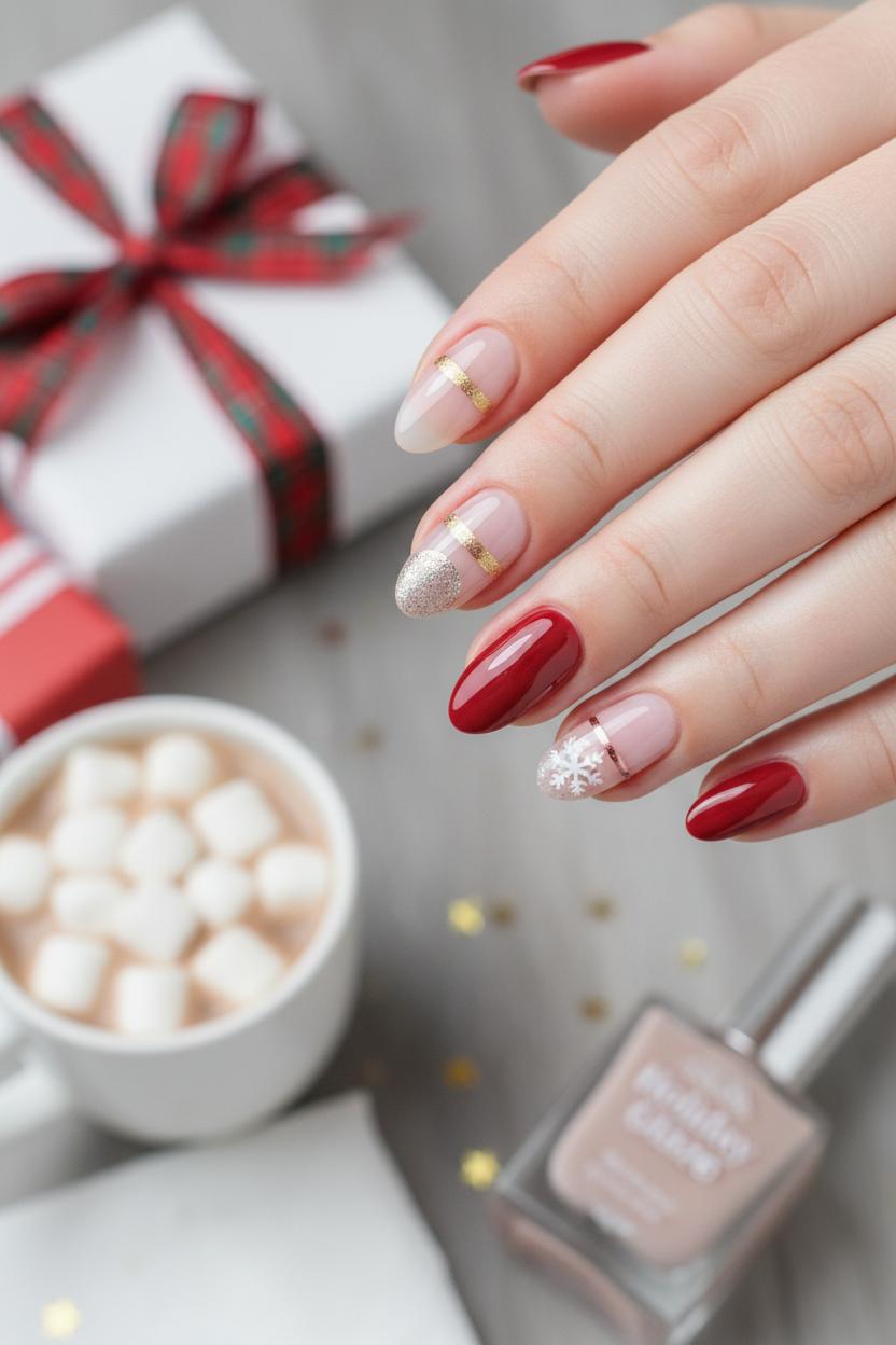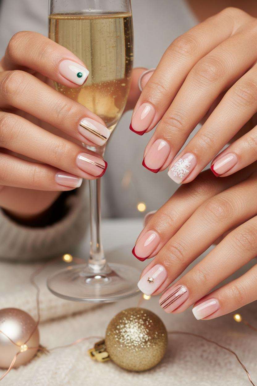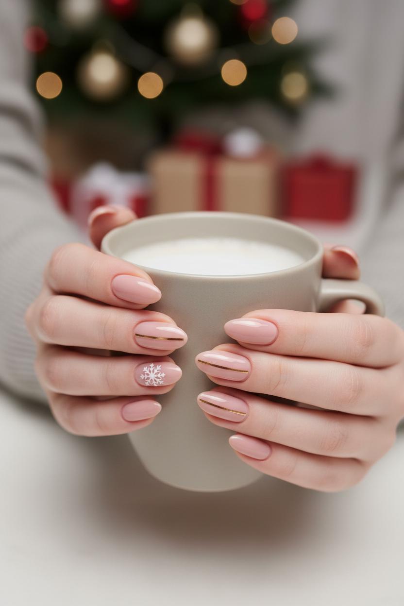 Lean into ten-minute layering tricks that look considered. Try a tonal “latte” skittle—five cozy neutrals from beige to cocoa across each hand—then anchor everything with a single red accent nail. Dot on a few tiny white “snow” specks over nude nail polish for a soft flurry and top with a quick dry top coat to lock it in before you’re out the door. A half-moon in champagne at the cuticle (trace with striping tape, paint, peel) feels vintage but simple. Whatever you choose, keep the coats thin, stick to one or two details per hand, and finish glossy; your easy christmas manicure will look polished, modern, and totally week-proof.