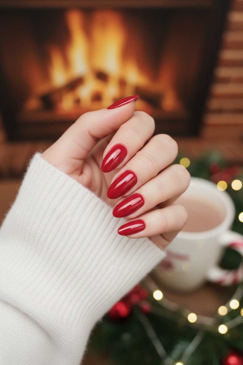 Prefer a pop of color? A full set in a classic cranberry or blue-toned gel red feels luxe on short nails, especially when you add a single micro-accent: a razor-thin gold stripe at the sidewall, a tiny star at the base, or one frosted tip on the thumb. Keep edges crisp and cuticles hydrated so the silhouette stays sleek, and finish everything with a quick dry top coat for that high-gloss, glassy seal and speedy out-the-door dry time. The beauty of these looks is how effortless they are to DIY—small touches, big holiday payoff, and zero fuss, proving that short christmas nails can be just as festive and modern as any elaborate set.