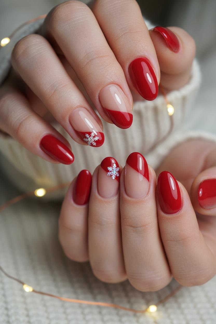 Here’s how I like to build it for an easy christmas manicure. Start with clean, shaped nails and a thin base. Map out your negative space using nail art striping tape—think a slim diagonal band across the tip, a curved side arc, or a half-moon at the cuticle. Paint one even coat of gel nail polish red on the exposed area, then cure. Gently remove the tape for those razor-sharp lines, and if you want a little sparkle, add the tiniest cluster of snowflake nail stickers in the corner of one accent nail. Seal everything with a glossy gel top coat; if you’re working with regular polish instead, a quick dry top coat will give you that glassy finish in minutes. This design is especially flattering on short christmas nails, because the negative space tricks the eye and elongates the nail bed, making the red pop even more.