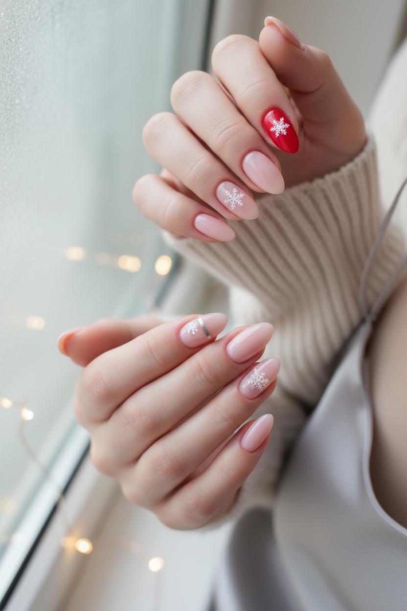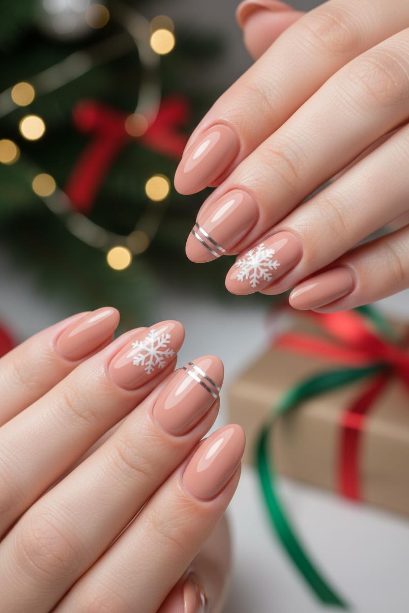 When you want that whisper-of-winter look without committing to a full-on nail art session, snowflake nail stickers are the easiest way to add a touch of magic to simple christmas nails. Think: a sheer wash of nude nail polish, one teeny snowflake floating near the cuticle, and plenty of negative space so your nails still feel clean and wearable for every holiday plan on your calendar. For nude holiday nails, try a soft beige or milky pink base and place one small sticker off-center on each ring finger; the asymmetry keeps it modern and makes even short christmas nails feel intentional and chic. If you’re craving a hint of color, anchor the look with a single accent nail in gel nail polish red and keep the rest whisper-light—one snowflake per hand is enough for minimalist holiday nails that still read festive.