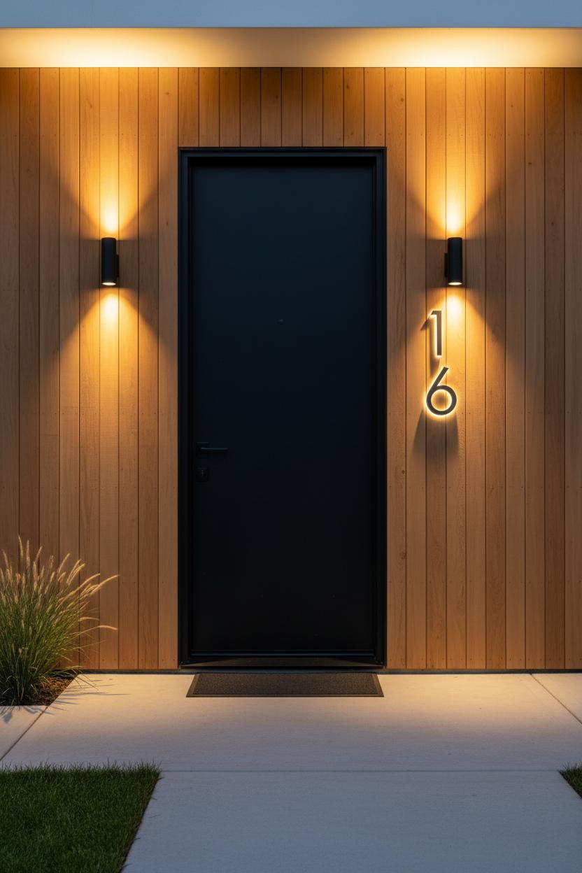 Play with texture to make the most of that light. On wood slat cladding, vertical sconces create soft, rhythmic shadows that emphasize the grain and bring warmth to modern home design. On smooth stucco or fiber cement, a crisp beam feels sculptural, like a light installation cut right into the wall. Flank your garage or side entry with matching fixtures to extend the glow, then tie it all together with backlit or halo-lit modern house numbers so your address becomes part of the composition. Keep finishes consistent—matte black, brushed graphite, or warm bronze—so the fixtures whisper rather than shout, letting the architecture lead.
