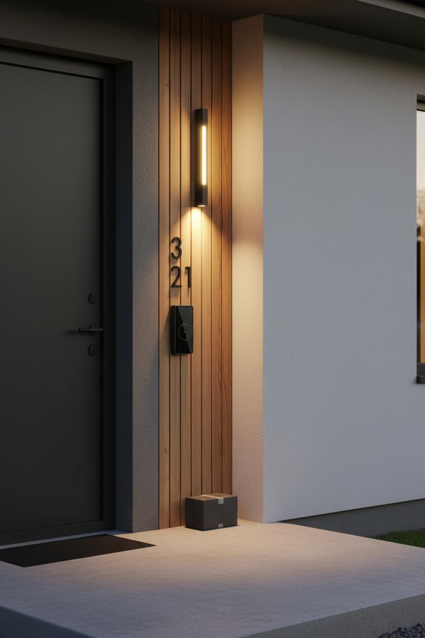 At the entry, use wood slat cladding to frame a simple door, then dial up the details. A matte black front door hardware set pops against honeyed wood, while an LED exterior wall sconce washes the slats in gentle light, accenting every shadow line after sunset. Add modern house numbers in a bold sans serif—either mounted directly on the slats or floated on a slim backplate—to feel like jewelry for the facade. If you’re integrating tech, choose a smart video doorbell with a slim, minimalist profile so it blends in rather than competing with the composition. Together, these layers boost curb appeal in a way that’s understated, considered, and incredibly photogenic.