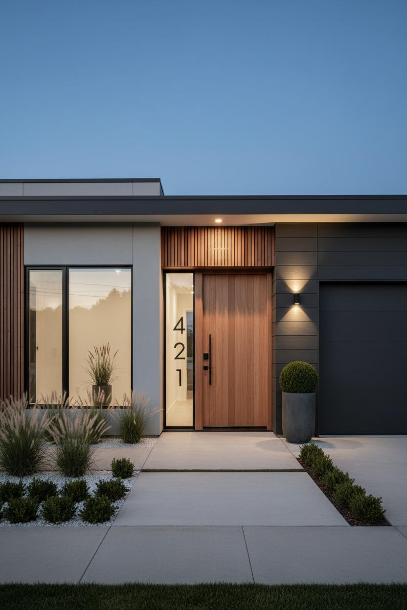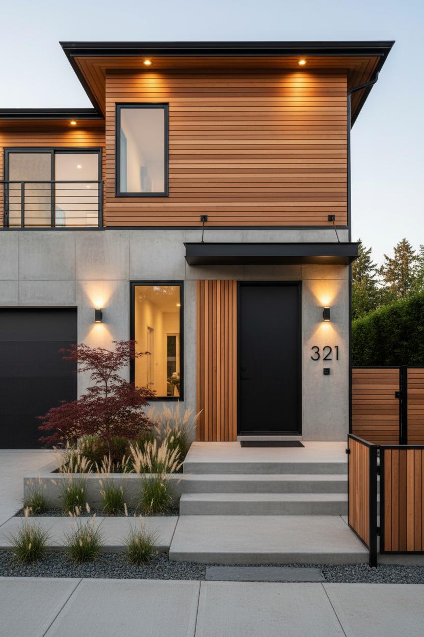 Light and hardware bring the look to life after dark and tie the palette together. A pair of LED exterior wall sconce fixtures that wash light across concrete or slats will dramatize texture and stretch the facade visually. Choose matte black front door hardware to echo your metal accents, then layer in clean, oversized modern house numbers to punctuate the entry. A slim smart video doorbell keeps the lines minimal while adding everyday convenience—so on-brand for minimalist architecture and modern home design. For wood, consider narrow slat spacing for privacy without heaviness; carry the slats to the soffit or gate to extend the language across the site. Keep landscaping sculptural—gravel beds, architectural grasses, and one statement tree—so the materials remain the star. If you’re worried about maintenance, look at thermally modified species or composite options that mimic natural tone. The result is a contemporary exterior that feels warm, edited, and intentional, with concrete’s permanence, metal’s precision, and wood’s soul all speaking the same design language for instant, lasting curb appeal.