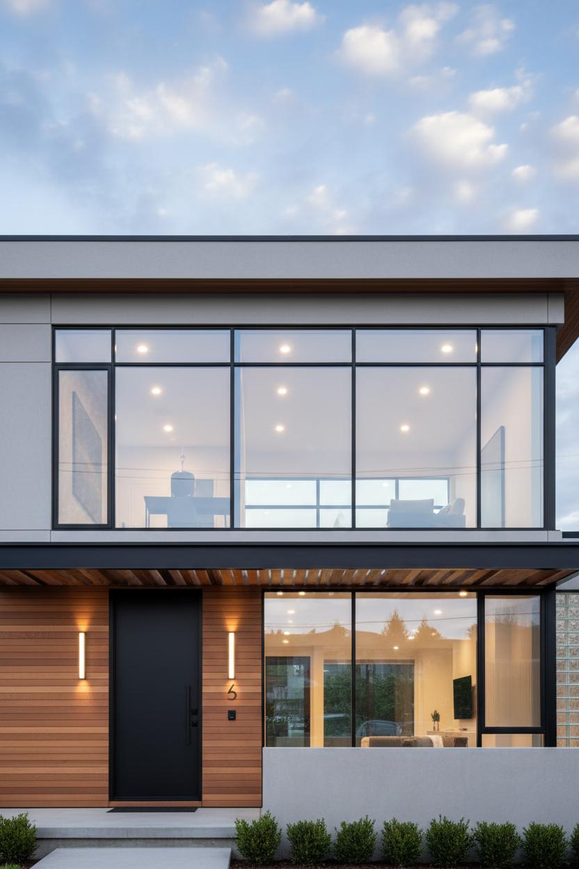 Performance is part of the beauty in modern home design. Low-E, double or triple glazing, and thermally broken frames keep interiors comfortable without bulking up the look. Deep overhangs, slim awnings, or a pergola can help manage sun while emphasizing those long, horizontal lines that boost curb appeal. At the entry, let details echo the windows’ sleek language: a matte black front door hardware set ties back to dark frames, and a smart video doorbell tucks in neatly without visual clutter. A pair of LED exterior wall sconce fixtures can graze the facade at dusk, tracing vertical lines and showing off textures in the cladding. Finish the composition with oversize modern house numbers—also in matte black—for a confident, gallery-worthy statement. The overall goal is restraint: fewer, larger window openings rather than many small ones, intentional alignment over ornament, and a tight palette of materials that feel tailored rather than busy. When glazing is this thoughtfully handled, the facade looks luminous by day and softly glowing by night—a quiet, elevated take on contemporary exterior style that feels as good to live with as it does to admire from the sidewalk.