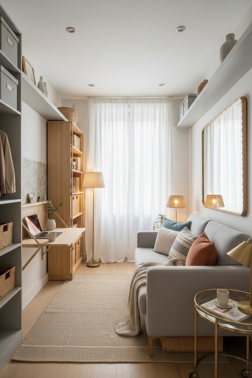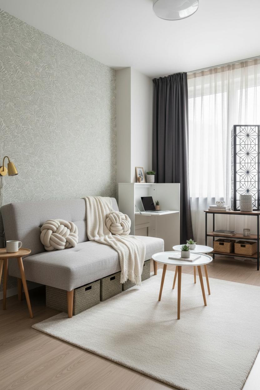 Start with smart foundations by setting up the bones of your small apartment decor to work as hard as you do. Keep a calm, cohesive color palette so each corner flows; then layer in texture for depth—think a woven rug, linen curtains hung high to elongate the room, and a strip of peel and stick wallpaper to visually zone an entry or headboard wall without risking your deposit. Mirrors opposite windows bounce light and make tight layouts feel generous, while slim-profile pieces anchor the room without adding bulk. Choose double-duty furniture first: a streamlined sofa bed turns a living area into guest quarters in a heartbeat, and a folding wall desk flips down for work time and tucks away when you’re off duty. These are the quiet space saving ideas that make tiny home design feel effortless and chic.