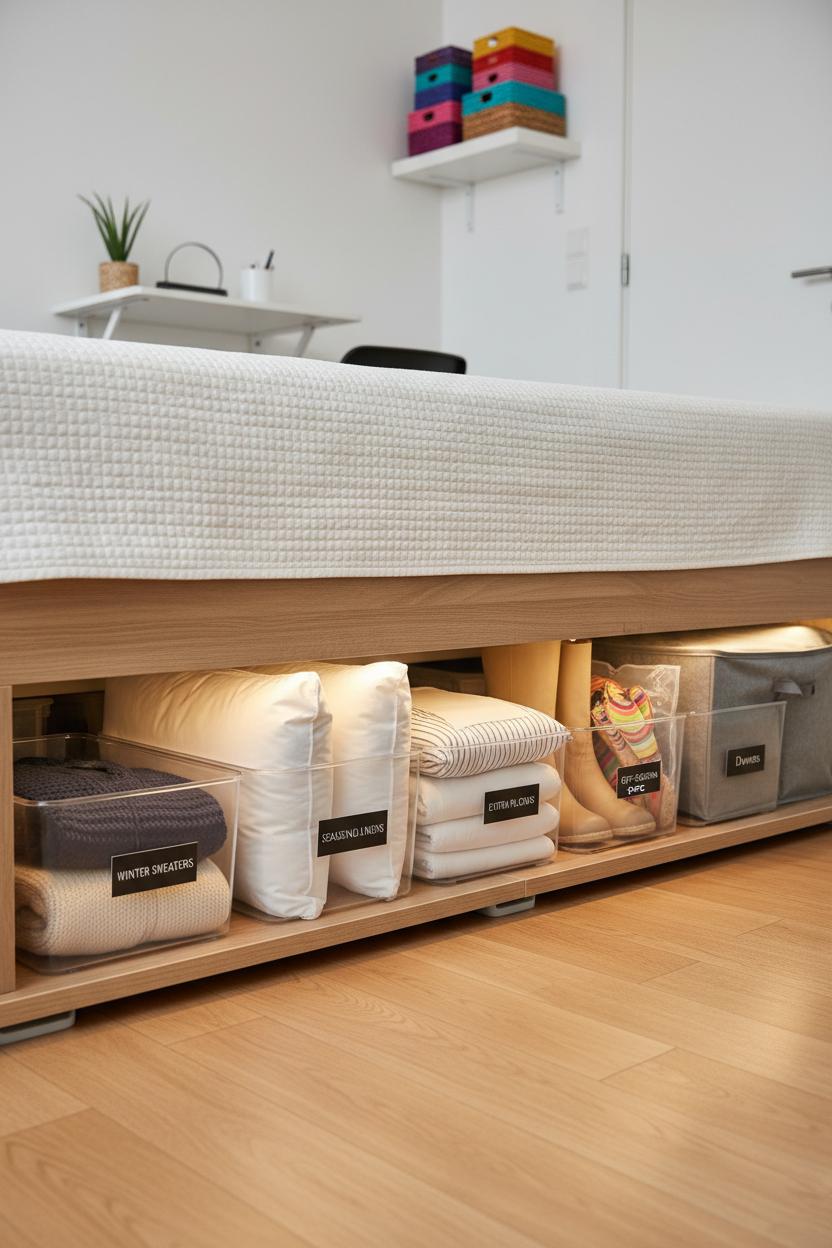 Think of the space under your bed as a secret closet just waiting to be styled. Low-profile under bed storage bins turn that overlooked sliver into neat rows of extra linens, seasonal sweaters, shoes, and even spare guest pillows. Clear, lidded bins on wheels are great for quick grab-and-go access; soft zippered varieties keep dust out and look tidy if they peek from a bed skirt. If you need a little more clearance, slim risers can lift your frame just enough to slide larger bins without making your bed feel “lofty.” For small apartment decor that actually works hard, label each bin and rotate by season so your everyday wardrobe always feels uncluttered. When every inch counts, pair this trick with over the door shelves for bags, scarves, and hats—more hidden capacity, zero floor space sacrificed. Consider vacuum bags for bulky items, then tuck them into the bins so everything stays streamlined.