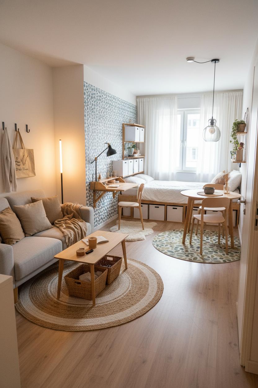 When you’re working with limited square footage, decluttering isn’t just about tossing extras—it’s about making space for the life you want to live. Start by zoning your rooms the way a tiny home design would: one area for lounging, one for working, one for dining, even if it’s all within a few feet. Use light to your advantage—task lamps for the desk zone, a warm floor lamp for the sofa corner—and let rugs visually define a “room” without adding bulk. If you’re craving personality, renter friendly decor like peel and stick wallpaper can frame a headboard wall or a mini office nook, signaling a shift in purpose while staying commitment-free. Think of the pathways between zones as sacred; keep them clear so the space feels airy and intuitive. This is one of those studio apartment tips that instantly changes the vibe: when your eye can travel without tripping over clutter, your home feels twice as big.