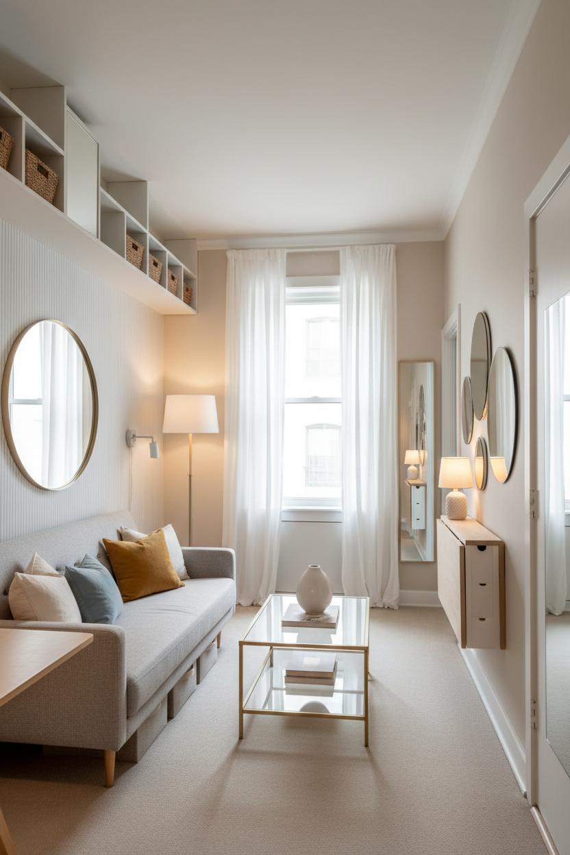 If you want your place to feel bigger without knocking down walls, start by choreographing light. Keep window treatments airy and hang curtains high and wide to expose as much glass as possible, then bounce that brightness around with mirrors. A single oversized mirror opposite a window can double the daylight, while a skinny mirror tucked near a doorway elongates a tight hall. Try clustering a few frameless mirrors into a casual gallery above a console or even on the backs of over the door shelves; the reflective surfaces keep storage from feeling bulky. Layer lamps at different heights—table, floor, and a plug-in sconce—to soften shadows. Warm bulbs around 2700–3000K create an inviting glow that blurs hard edges, which is one of my favorite studio apartment tips for instantly cozier, airier evenings.