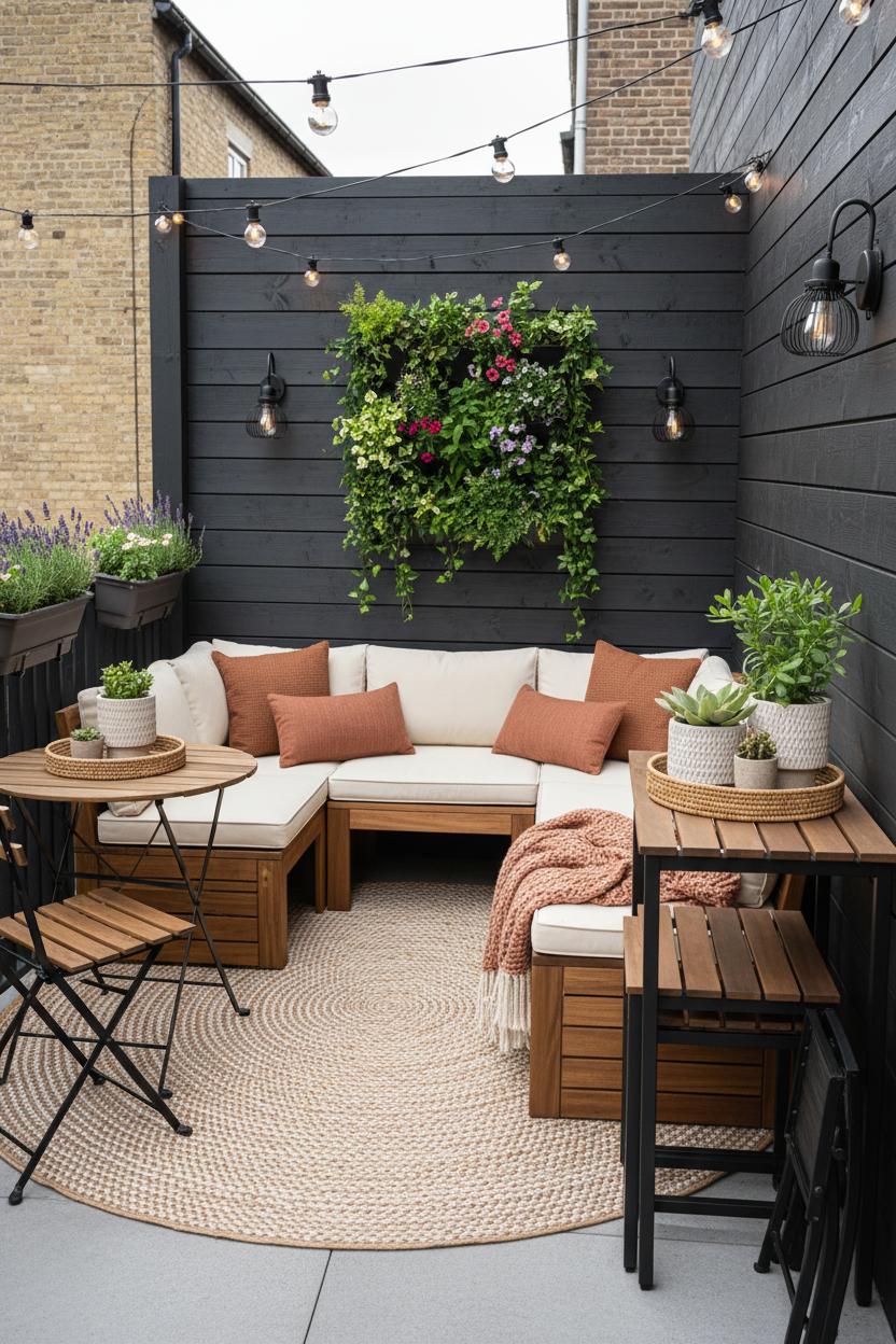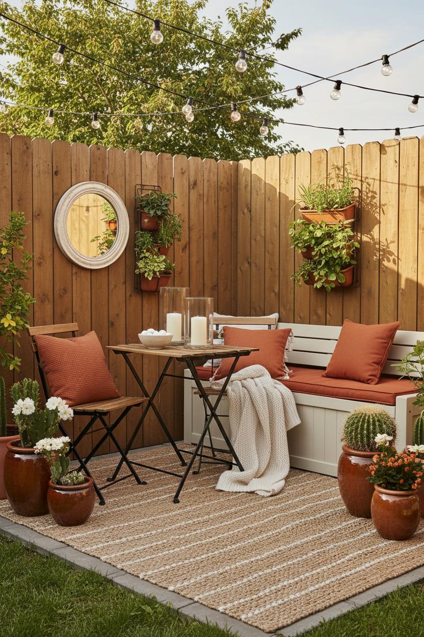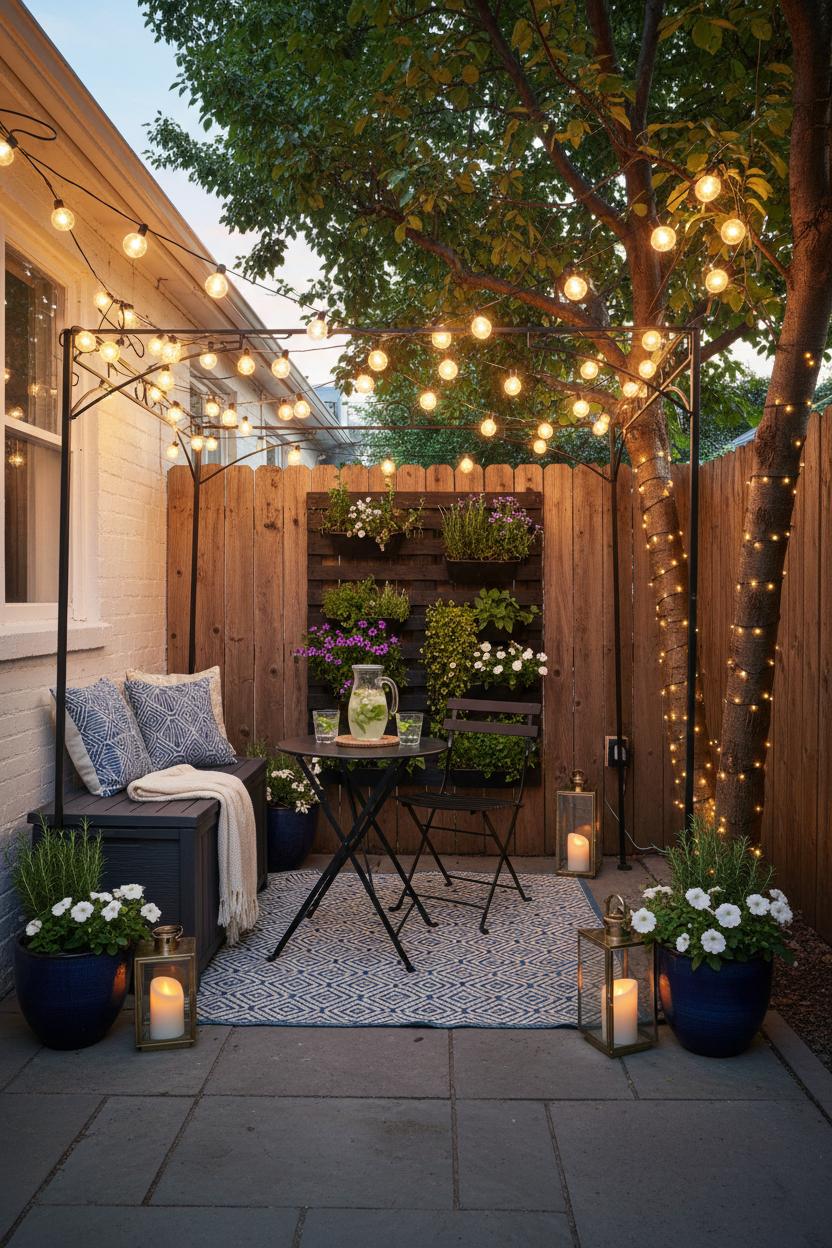 Go vertical to gain square footage you didn’t know you had. A vertical garden planter transforms a blank fence into a living wall, freeing up floor space for lounging while bringing that lush, Pinterest-ready feel. Layer in string lights outdoor overhead to draw the eye up and wash the whole area in a warm glow; drape them from a pergola, a tree, or simple wall hooks for instant ambiance on a budget. Add rail planters or slim trellises to screen a less-than-lovely view, and clip-on lanterns to posts for soft, sculptural light. Keep small patio decor simple but textural—think woven trays, a couple of chunky planters, and cozy throws—so your layout shines. With a few smart swaps and up-the-wall moments, your backyard makeover becomes less about square footage and more about flow, comfort, and charm. Every foot works harder, and your petite patio suddenly feels like a private, pocket-sized retreat.