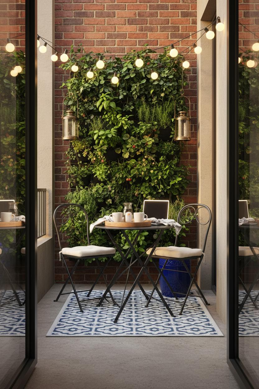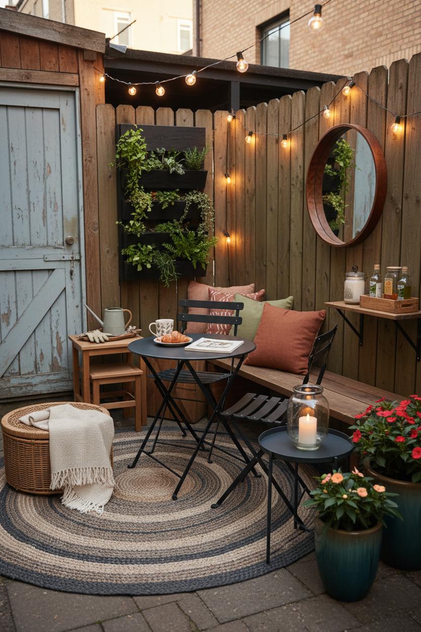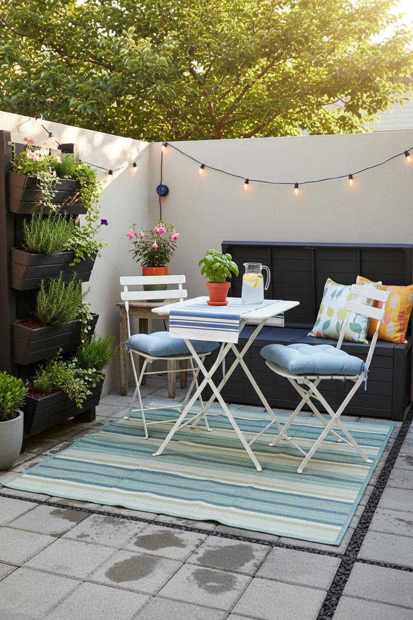 For atmosphere, think vertical, layered, and glowing. A vertical garden planter turns a blank wall into a living backdrop—herbs, trailing ivy, even strawberries—freeing the floor while giving you scent and softness. Drape string lights outdoor overhead so the bistro table glitters like a little Paris street corner; they’re forgiving and magical, especially when paired with a couple of lanterns at different heights. Keep your palette tight: two main colors and a warm metallic or natural wood accent. Add thin, tie-on chair cushions and a small tray that shuttles from kitchen to terrace in one effortless trip—tiny luxuries that read as intentional small patio decor. When you’re done, fold the set and slip cushions, citronella, and napkins into an outdoor storage bench so everything stays tidy and dry for the next sit-down.