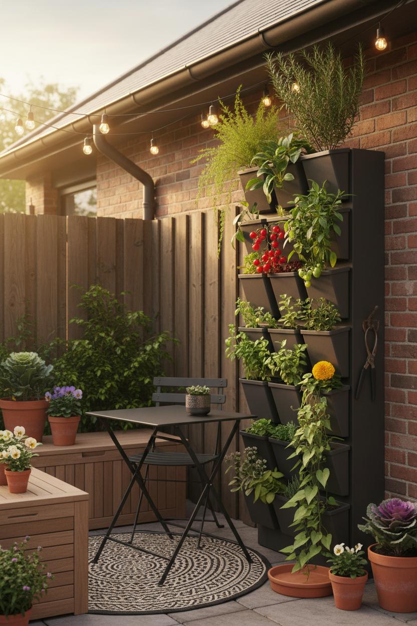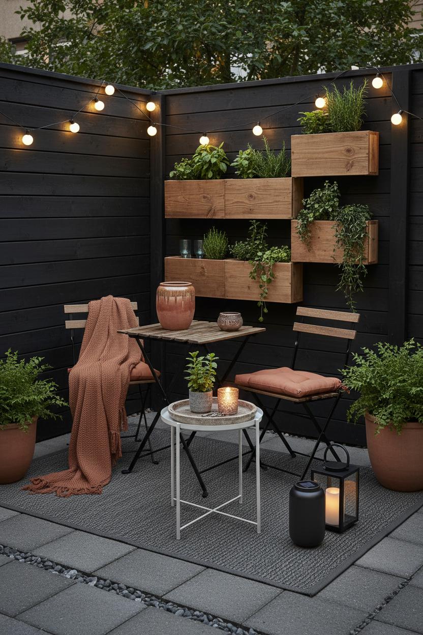 Lighting is your secret sauce. Drape string lights outdoor from fence to tree for that golden-hour glow that makes everything look styled, even on a budget. If your walls or fencing feel flat, paint them a fresh neutral and add height with a vertical garden planter. Trailing herbs, tiny strawberries, and a few blooms draw the eye up, creating the illusion of more square footage while doubling as living art. For small patio decor that works hard, mix lightweight planters in a tight color palette, then add textured cushions and a cozy throw to soften the scene. Keep the palette focused—think earthy terracotta, creamy linens, and a pop of sage—so the whole space reads cohesive instead of cluttered.