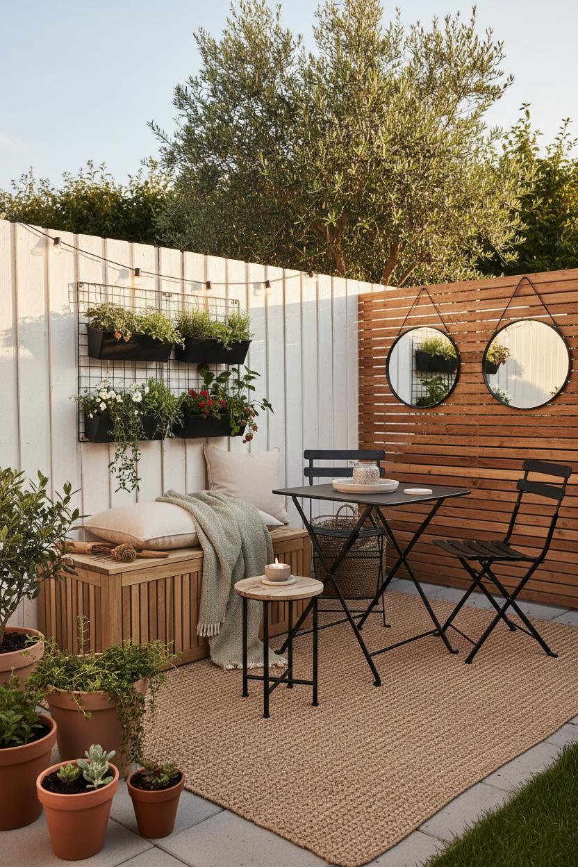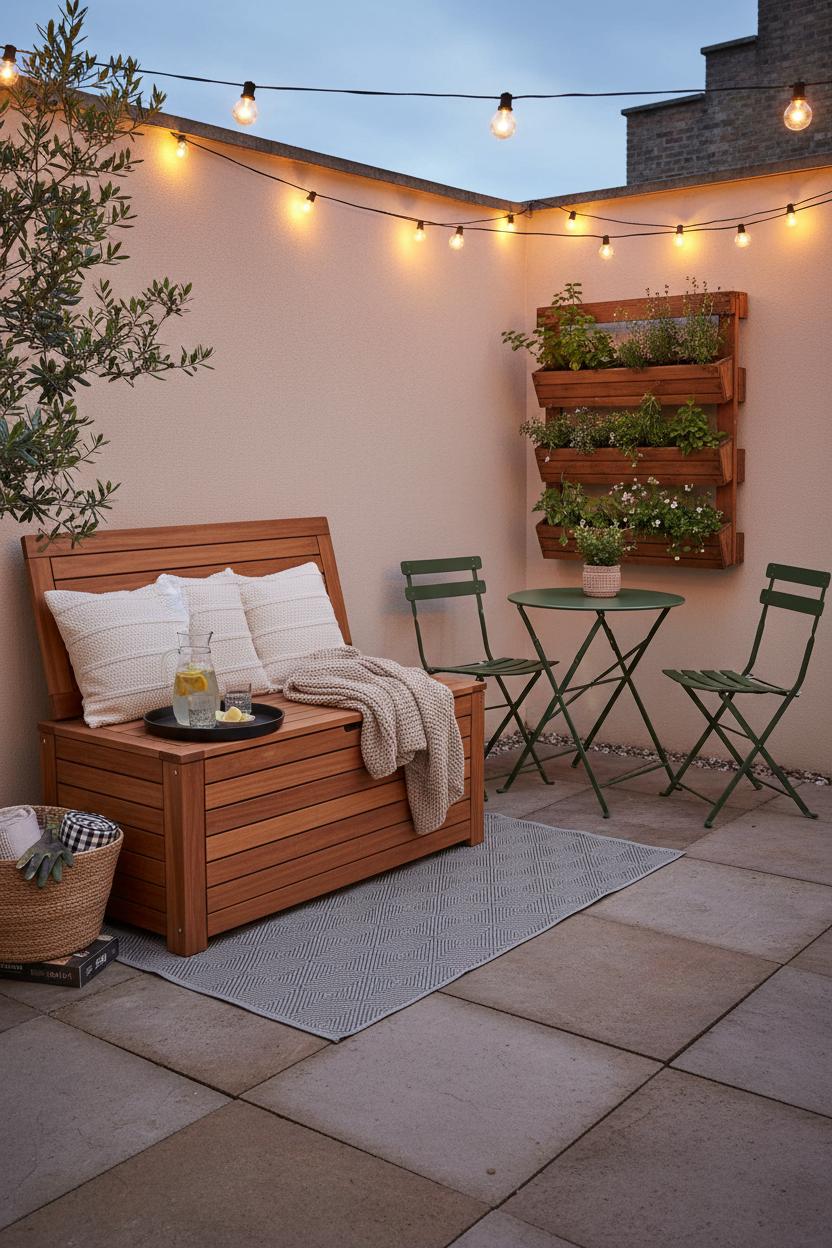 When every square foot counts, a hardworking outdoor storage bench becomes the quiet hero of your patio. It’s seating, it’s stash space, and it’s the easiest way to hide the chaos—garden gloves, extra pillows, outdoor games—all in one tidy spot. Think of it as the anchor of your small backyard ideas: tuck a slim outdoor rug waterproof beneath to define the zone, add a couple of neutral cushions on top, then layer in texture with a throw and a tray for iced tea. Round out the scene with a folding bistro set that can scoot out of the way when guests arrive, and lift the eye with a vertical garden planter to keep floors clear. As the sun drops, flick on string lights outdoor for instant glow and cozy vibes. Suddenly, your space-saving outdoor setup feels intentional, styled, and way more serene—like a mini living room under the sky.