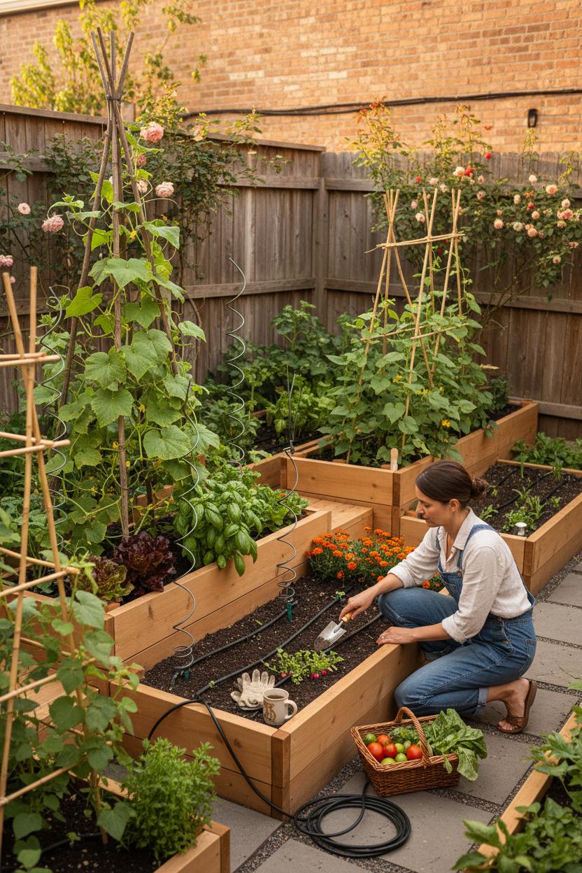 Raised garden beds are the secret sauce for tight footprints because they concentrate good soil and keep things tidy. If you’re short on time, a raised garden bed kit gets you planting faster; fill it with a rich garden soil mix and a blanket of compost so roots can dive deep. Try a simple grid or square-foot layout to keep spacing intuitive—especially helpful for vegetable gardening for beginners. Go vertical wherever you can: add string trellises for tomatoes, an obelisk for peas, even a fence panel turned into a leafy wall. A drip irrigation kit threads under mulch and gives each plant a steady sip without wasting water or soaking your pathways. Choose compact or determinate varieties and sprinkle in a few heirloom vegetable seeds for flavor and color that feel like a little garden magic.
